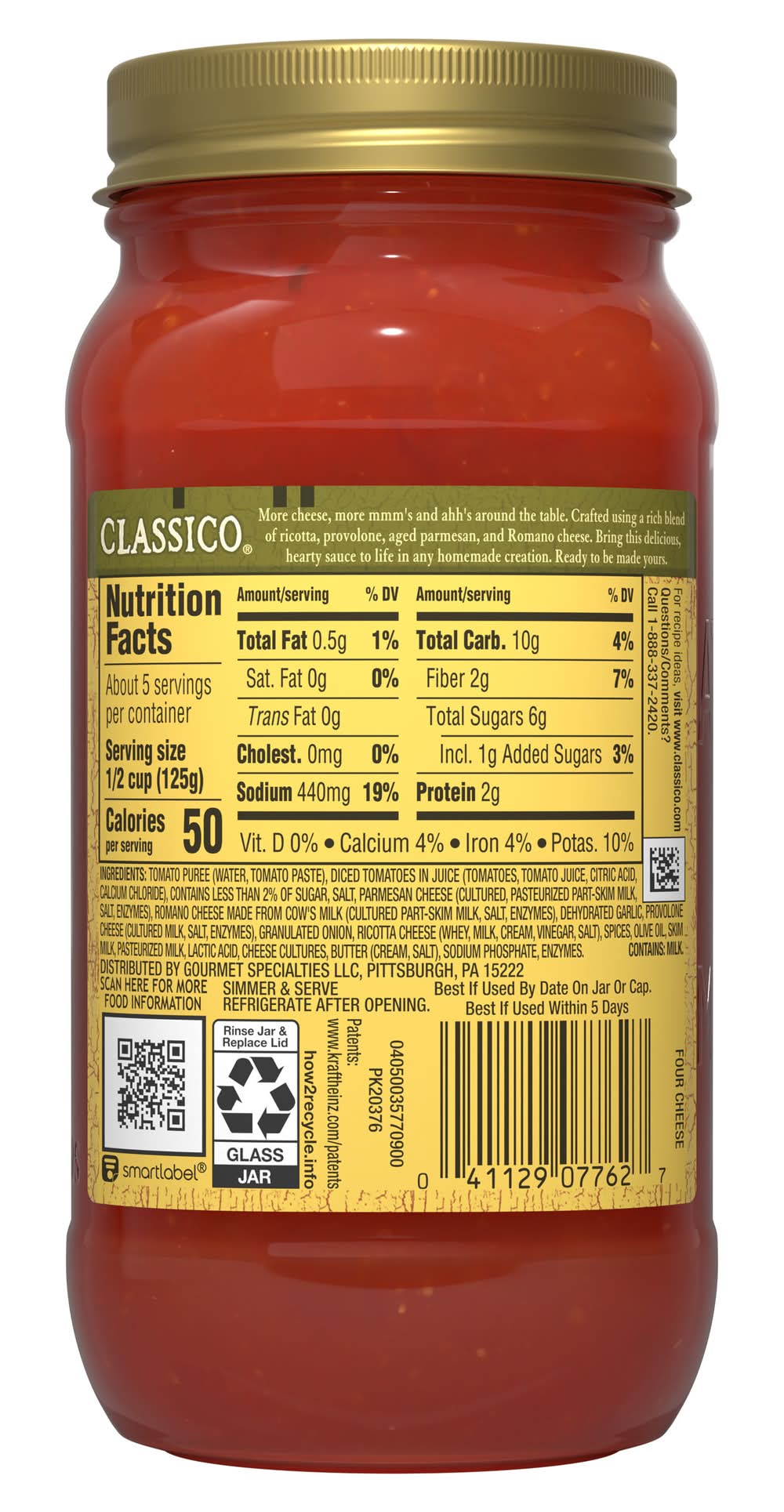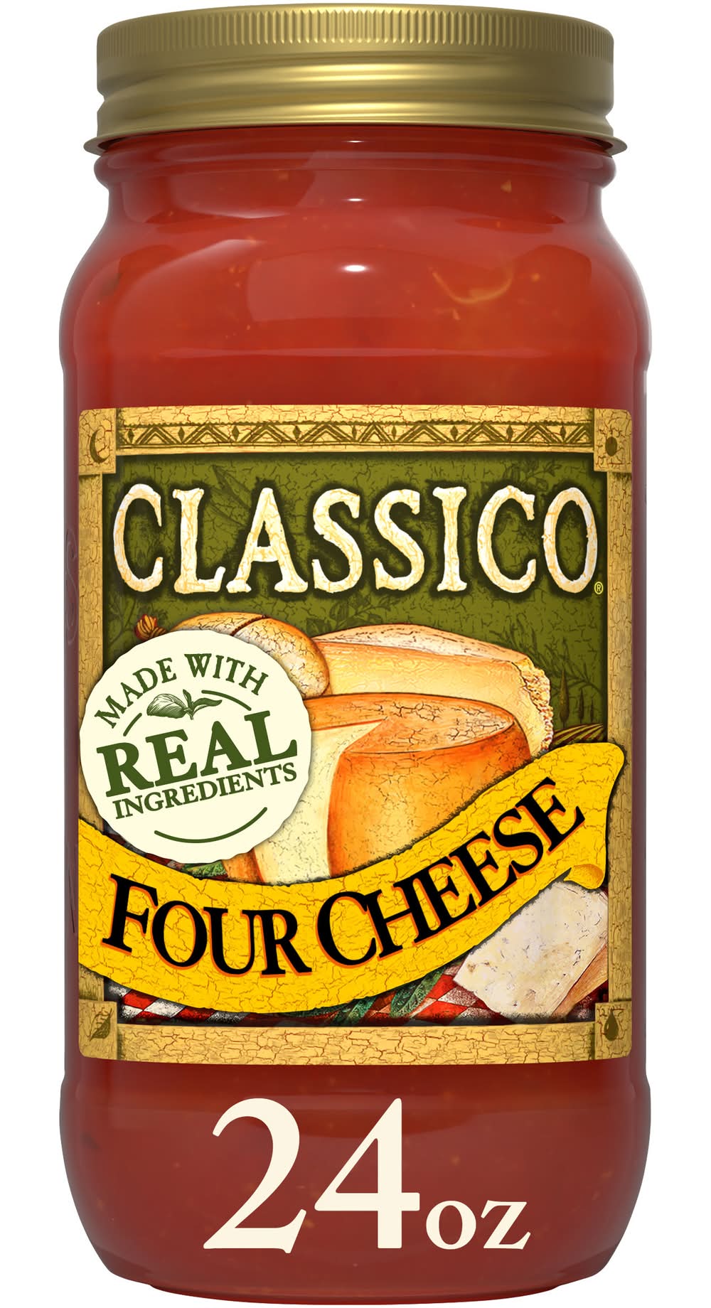 In Parma, cheese-making has been raised to an art form. Here, fresh Ricotta, Provolone, and aged Parmesan and Romano cheeses add a wonderful richness to this red ripened tomato sauce, More cheese, more mmm's and ahh's around the table. Classico Four Cheese Pasta Sauce is easy to prepare and offers a rich, flavorful taste. Made with real ingredients, our sauce features a rich blend of ricotta, Provolone, aged Parmesan and Romano cheese. Simply simmer and serve our sauce with your favorite dish. Use our pasta sauce in a classic spaghetti and meatballs dish or a pasta casserole, on your homemade pizza, or as a dipping sauce for garlic bread. Be sure to refrigerate. jar of sauce after opening. • Flavor: Four cheese • Packaging: Reusable