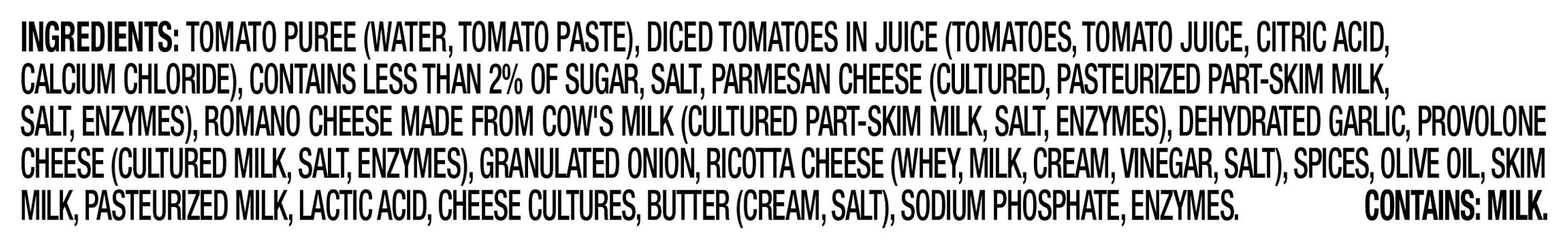 Ingredients: TOMATO PUREE (WATER, TOMATO PASTE), DICED TOMATOES IN JUICE (TOMATOES, TOMATO JUICE, CITRIC ACID, CALCIUM CHLORIDE), CONTAINS LESS THAN 2% OF SUGAR, SALT, PARMESAN CHEESE (CULTURED, PASTEURIZED PART-SKIM MILK, SALT, ENZYMES), ROMANO CHEESE MADE FROM COW'S MILK (CULTURED PART-SKIM MILK, SALT, ENZYMES), DEHYDRATED GARLIC, PROVOLONE CHEESE (CULTURED MILK, SALT, ENZYMES), GRANULATED ONION, RICOTTA CHEESE (WHEY, MILK, CREAM, VINEGAR, SALT), SPICES, OLIVE OIL, SKIM MILK, PASTEURIZED MILK, LACTIC ACID, CHEESE CULTURES, BUTTER (CREAM, SALT), SODIUM PHOSPHATE, ENZYMES. Contains: Milk