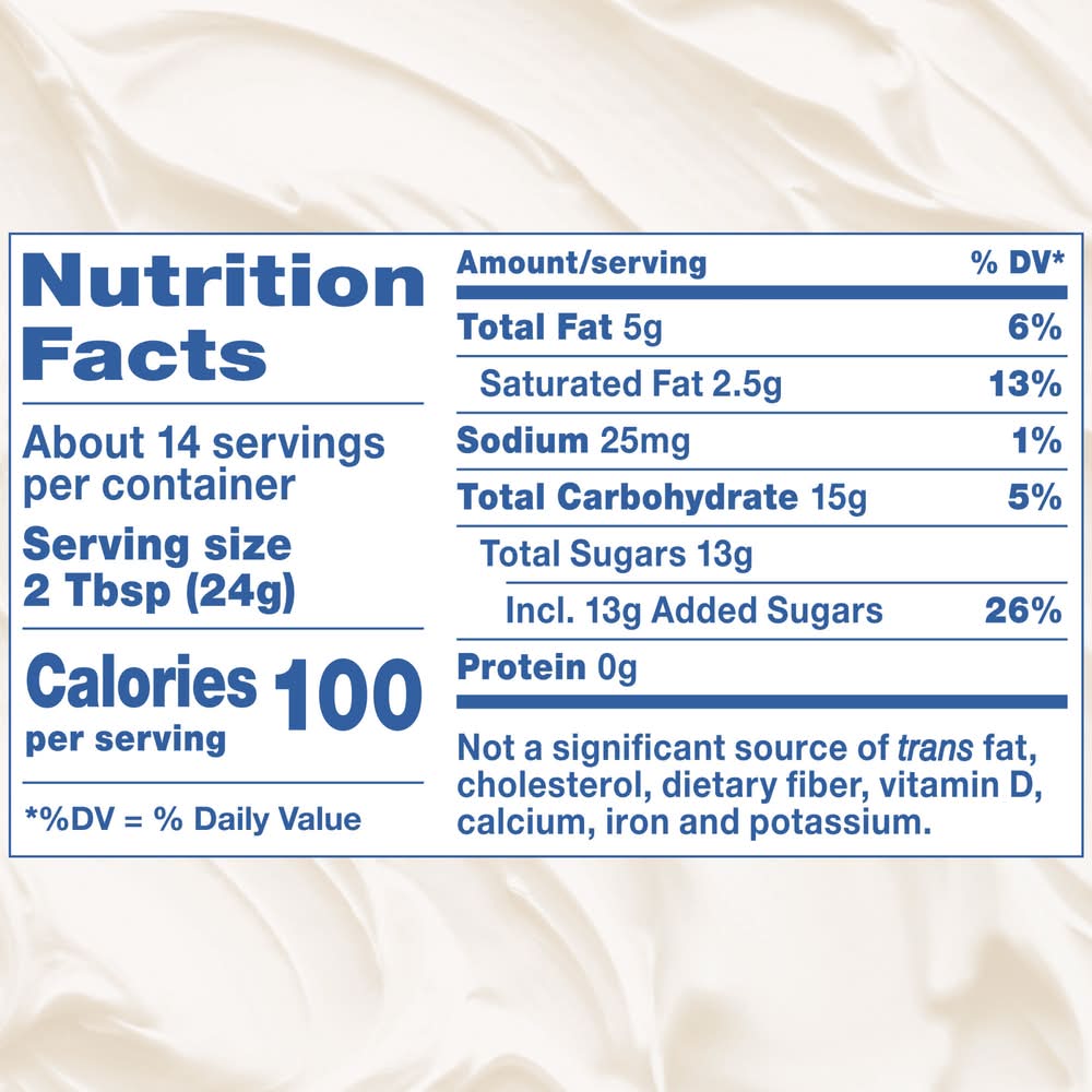 Ingredients: Sugar, Palm Oil, Water, Corn Syrup, Canola Oil, Corn Starch, Contains 2% or less of: Natural and Artificial Flavor, Mono-and Diglycerides, Modified Corn Starch, Cellulose, Salt, Propylene Glycol Monostearate, Carrageenan, Distilled Monoglycerides, Polysorbate 80, Potassium Sorbate (Preservative), Sodium Stearoyl Lactylate, Antioxidants (Citric Acid, Ascorbyl Palmitate, Mixed Tocopherols, Chamomile and Rosemary Extract), Artificial Color. Contains: Soybean Ingredients.