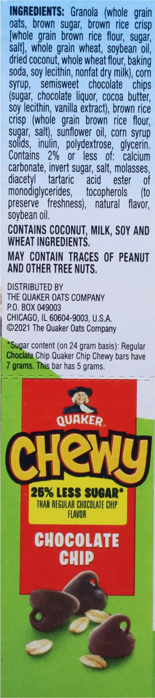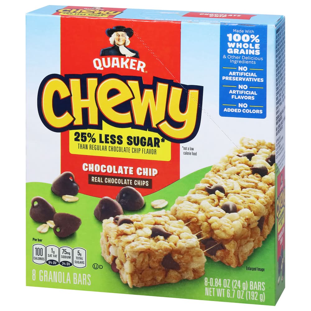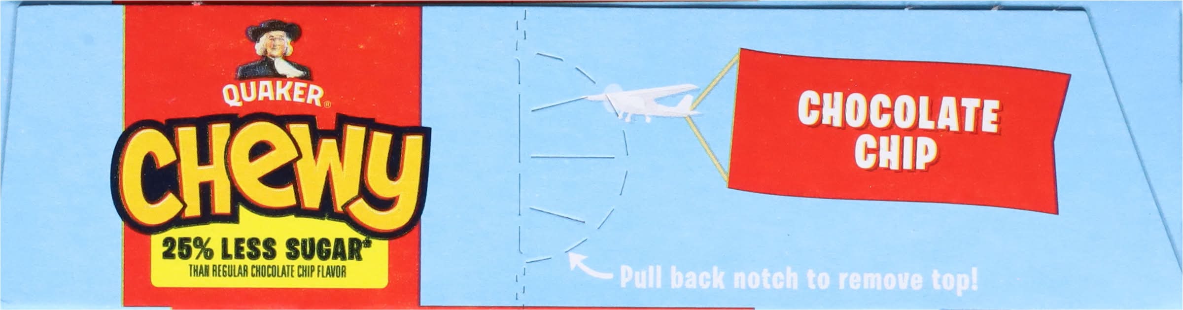 Give your family the Chewy Chocolate Chip taste they love, but with 25% less sugar than Regular. Still full of chocolate chips and made with whole grains, it's a snack you can feel good about giving your family. • Flavor: Chocolate chip • Pack size: 8 • The Quaker Oats Company, Chicago • Packaging: Reusable