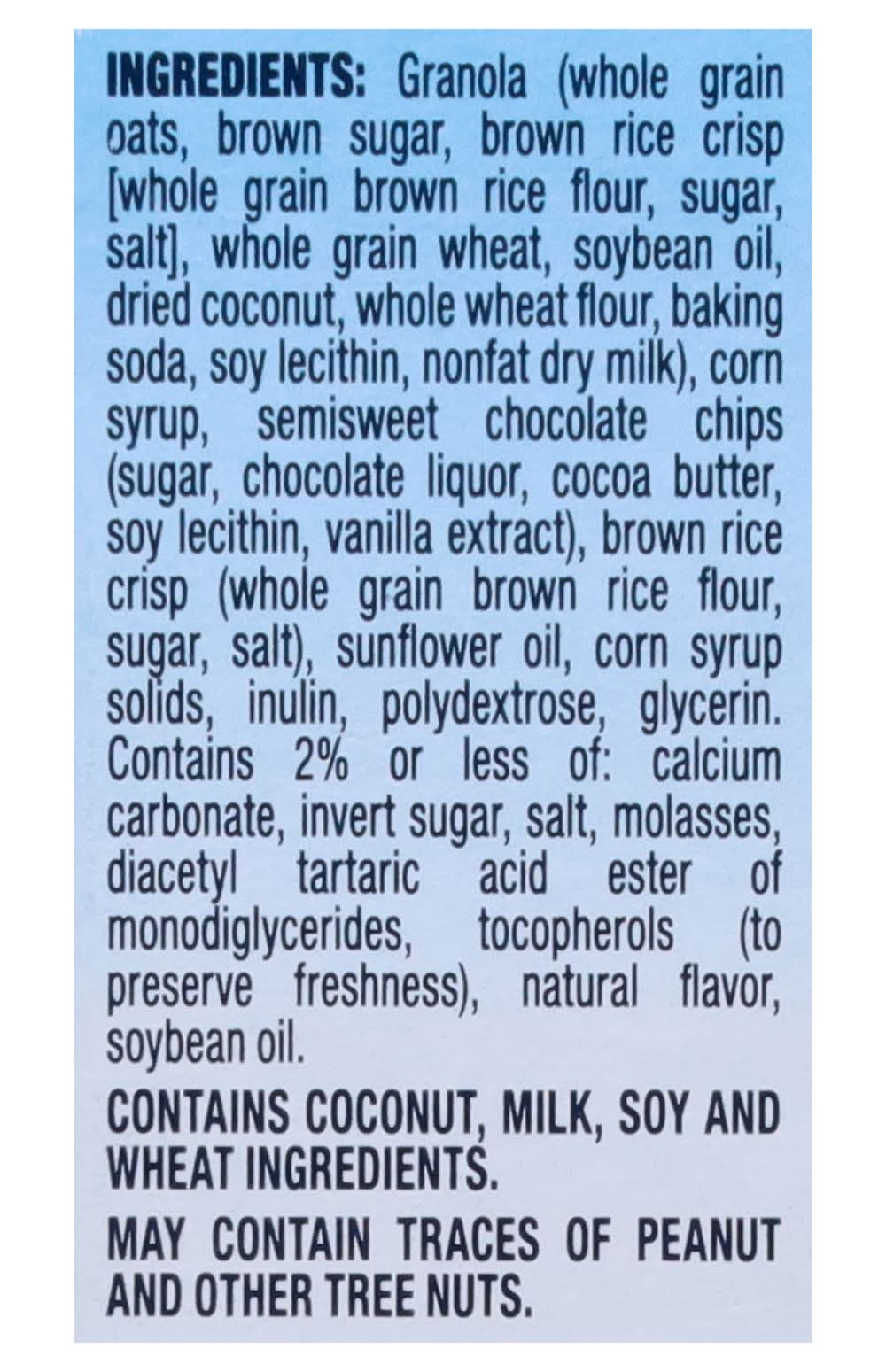 Ingredients: Granola (Whole Grain Oats, Brown Sugar, Brown Rice Crisp [Whole Grain Brown Rice Flour, Sugar, Salt], Whole Grain Wheat, Soybean Oil, Dried Coconut, Whole Wheat Flour, Baking Soda, Soy Lecithin, Nonfat Dry Milk), Corn Syrup, Semisweet Chocolate Chips (Sugar, Chocolate Liquor, Cocoa Butter, Soy Lecithin, Vanilla Extract), Brown Rice Crisp (Whole Grain Brown Rice Flour, Sugar, Salt), Sunflower Oil, Corn Syrup Solids, Inulin, Polydextrose, Glycerin, Contains 2% or Less of: Calcium Carbonate, Invert Sugar, Salt, Molasses, Diacetyl Tartaric Acid Ester of Monodiglycerides, Tocopherols (to Preserve Freshness), Natural Flavor, Soybean Oil Contains: Oat, Wheat, Soybeans, Tree Nuts, Coconuts, Milk, Corn, Peanuts, Tree Nuts