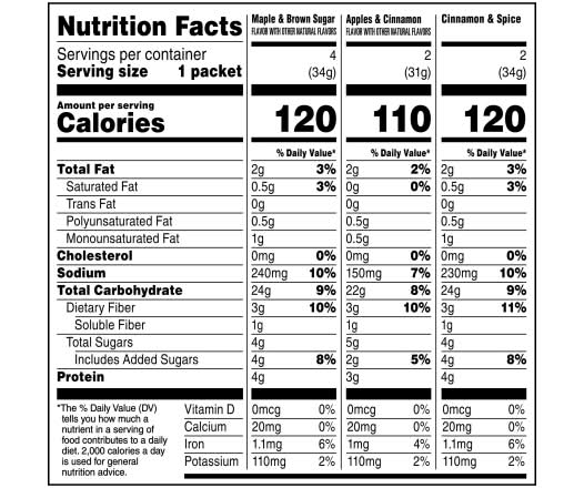Ingredients: Maple and Brown Sugar Ingredients: Whole Grain Oats, Sugar, Salt, Natural Flavor, Monk Fruit Extract. Apple & Cinnamon Ingredients: Whole Grain Oats, Dried Apples, Sugar, Salt, Cinnamon, Monk Fruit Extract, Natural Flavor. Cinnamon & Spice Ingredients: Whole Grain Oats, Sugar, Salt, Cinnamon, Spices, Monk Fruit Extract, Natural Flavor.