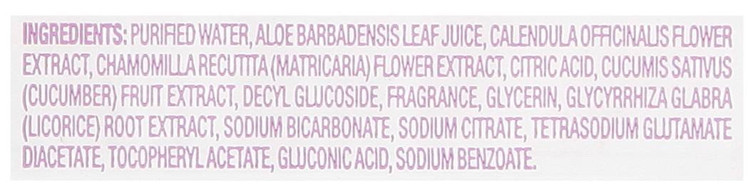 Ingredients: Purified Water, Aloe Barbadensis Leaf Juice, Calendula Officinalis Flower Extract, Chamomilla Recutta (Matricaria) Flower Extract, Citric Acid, Cucumis Sativus (Cucumber) Fruit Extract, Decyl Glucoside, Fragrance, Glycerin, Glycyrrhiza Glabra (Licorice) Root Extract, Sodium Bicarbonate, Sodium Citrate, Tetrasodium Glutamate Diacetate, Tocopheryl Acetate, Gluconic Acid, Sodium Benzoate.