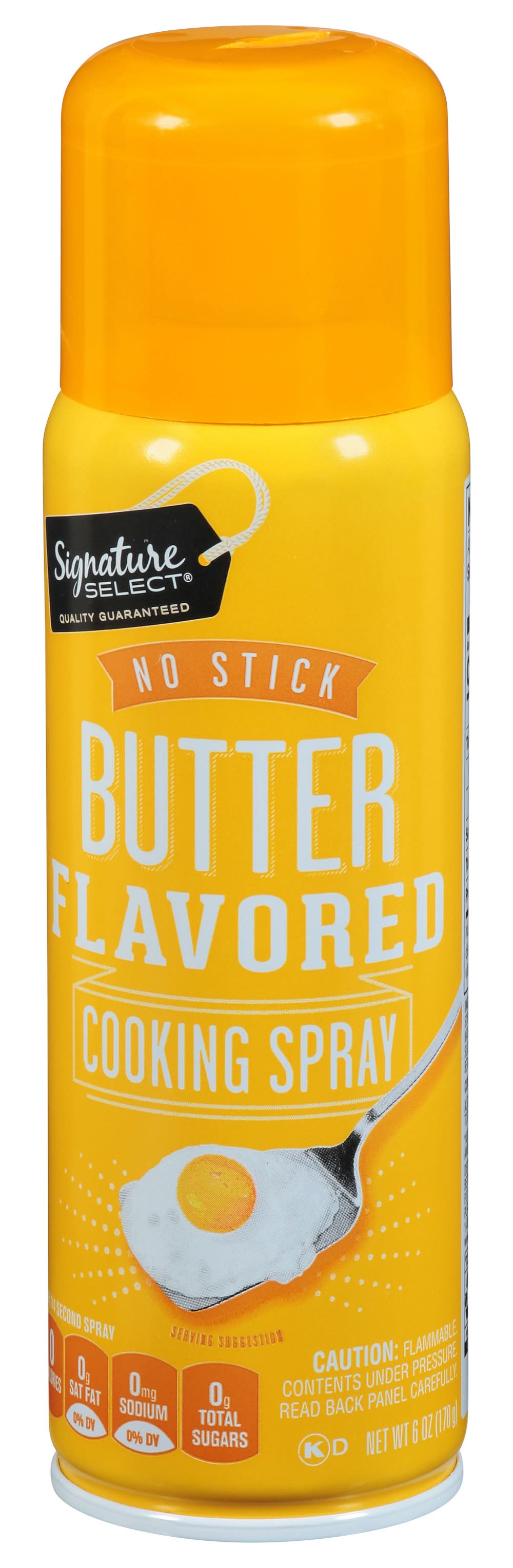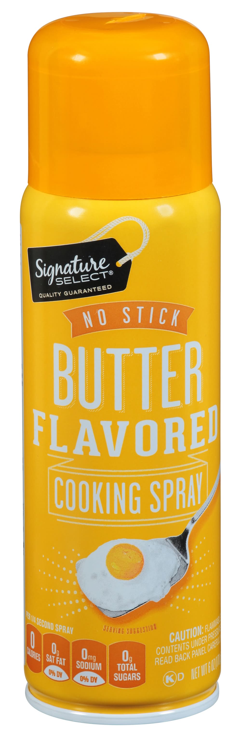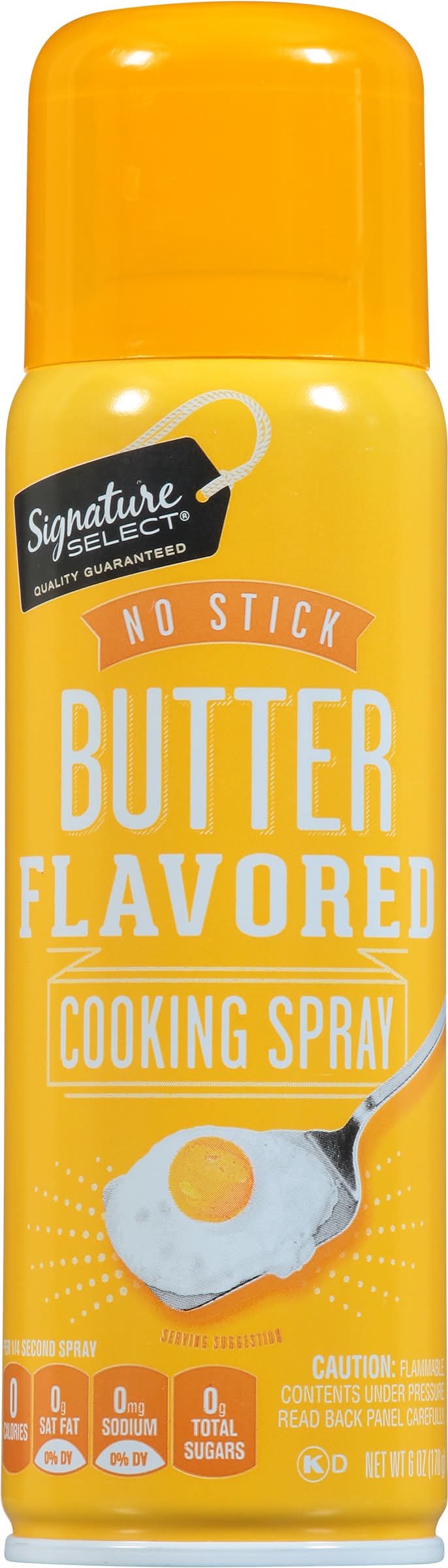 Per 1/4 Second Spray: 0 calories; 0 g sat fat (0% DV); 0 mg sodium (0% DV); 0 g total sugars. Our Signature is Our Promise: Use signature select butter flavored cooking spray in place of butter, margarine and shortening for easy cleanup when baking, broiling, frying or microwave cooking. Quality guaranteed. Our promise, quality & satisfaction. 100% guaranteed or your money back. how2recycle.info. www.betterlivingbrandsllc.com. SmartLabel: Scan for more food information or call 1-888-723-3929. Number of servings: 565