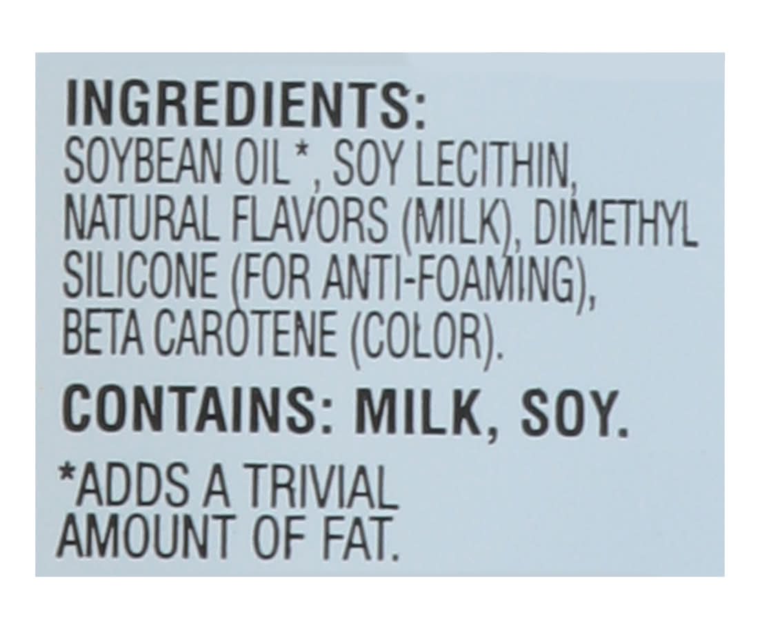 Ingredients: Soybean Oil (Adds a Trivial Amount of Fat), Soy Lecithin, Natural Flavors (Milk), Dimethyl Silicone (for Anti-Foaming), Beta Carotene (Color). Contains: Milk, Soybeans