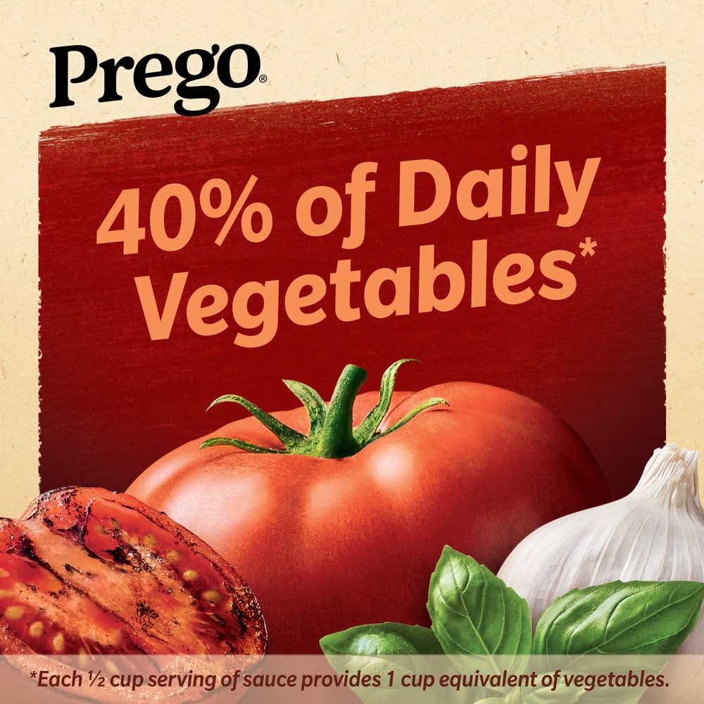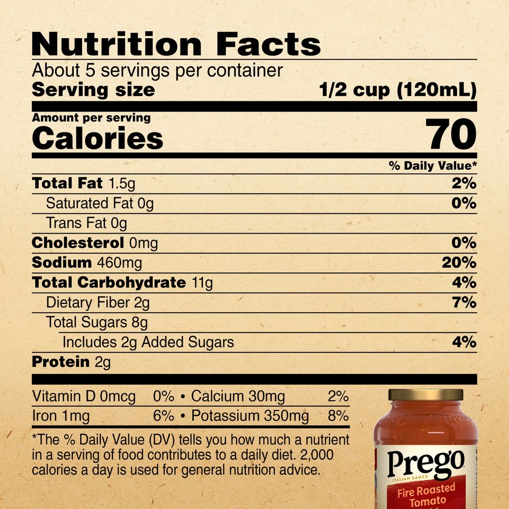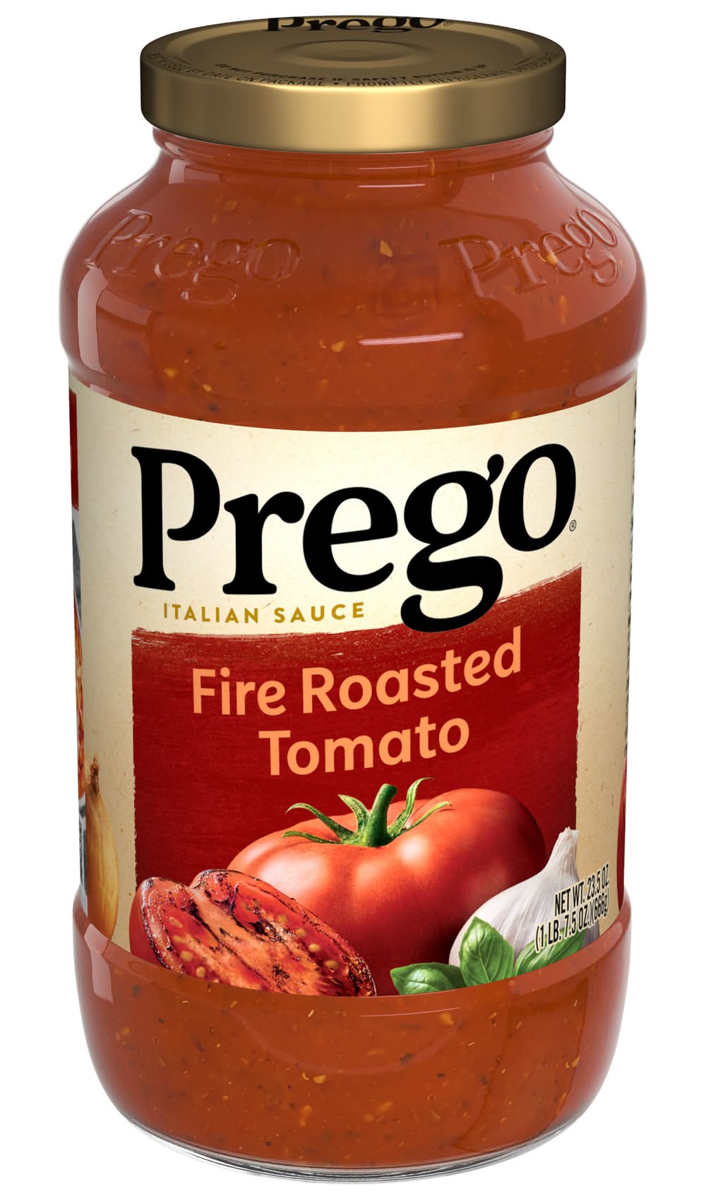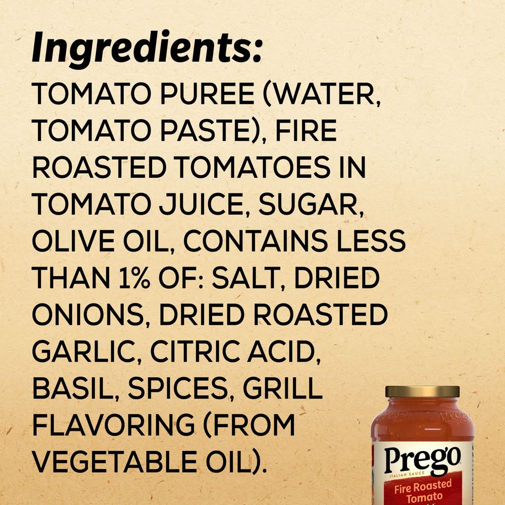 Be the hero at dinner with Prego Fire Roasted Tomato Pasta Sauce. Versatile and delicious, this red sauce features the rich, sweet taste of fire roasted tomatoes balanced with flavorful herbs and spices. This tomato sauce has a taste everyone loves and a thick texture that doesn’t water out, making it a perfect pairing with any pasta. Prego pasta sauce is gluten free and made almost entirely of vegetables for a pasta sauce you can feel good about. Each half-cup serving provides 40 percent of your daily vegetables, giving you a pasta sauce that’s as nutritious as it is tasty. Top off any pasta with this Prego Italian sauce for a quick, family-pleasing meal, or use it as a base for your favorite recipes. The tomato sauce jar top is easy to close and store in the refrigerator for leftovers. Give your family the taste everyone loves with Prego. In addition to Fire Roasted Tomato Pasta Sauce, Prego offers a variety of other crowd-pleasing favorites, including Chunky Tomato, Garlic and Onion Italian Sauce, Mushroom and Green Pepper Sauce and more! Flavor: Fire roasted tomato