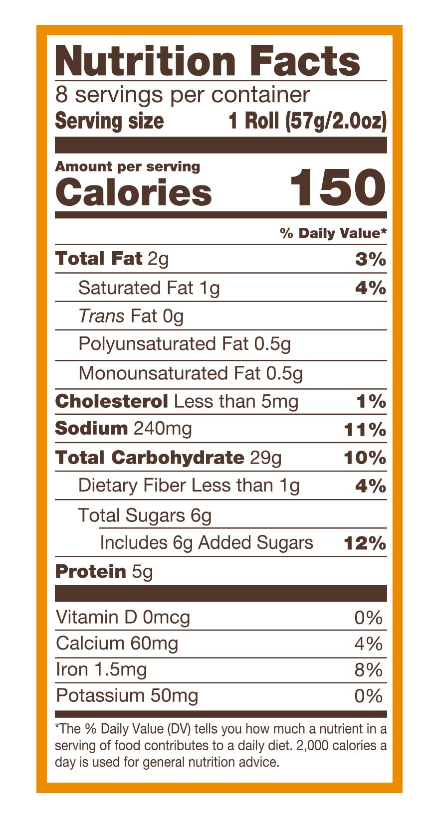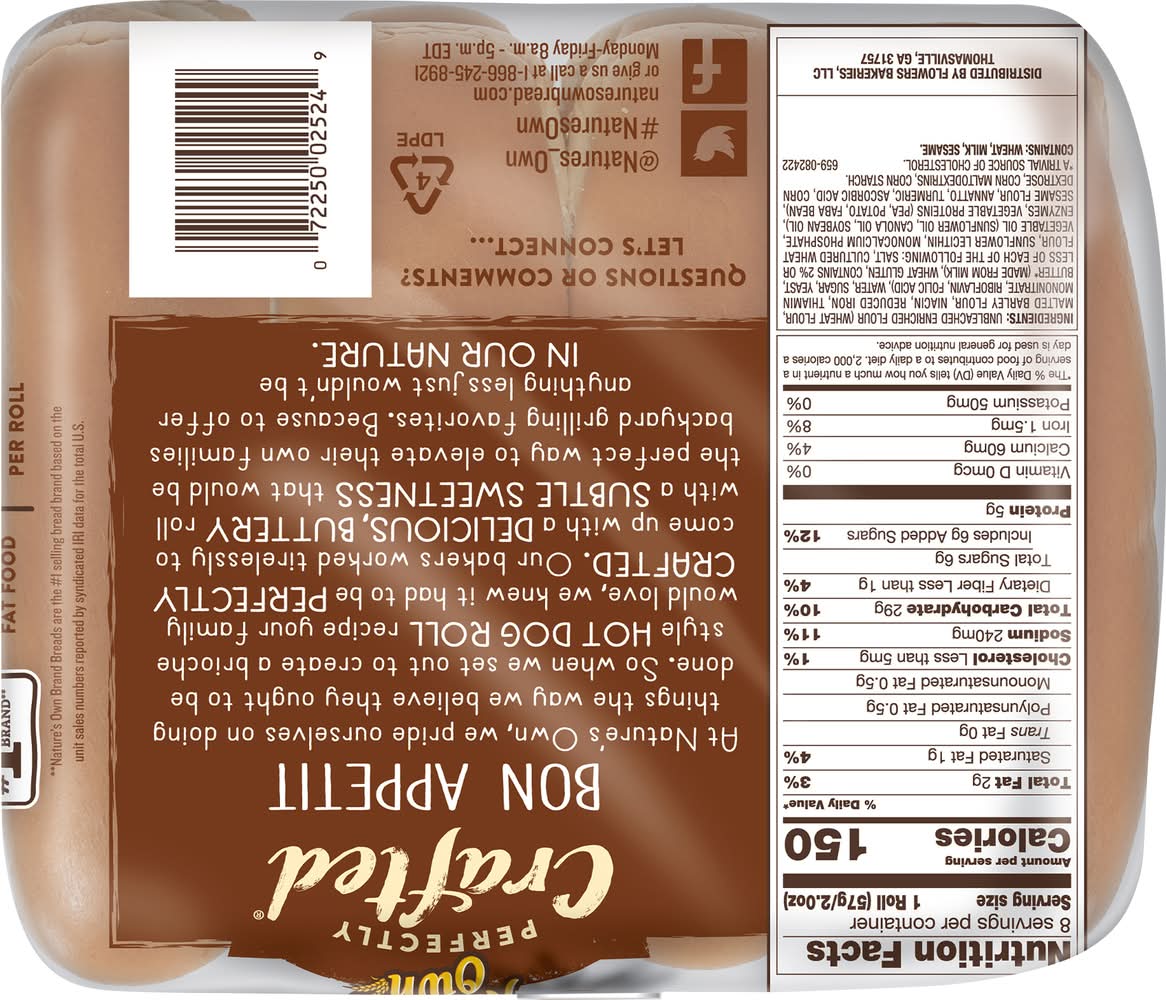 8ct hot dog rolls. Never any artificial preservatives, colors or flavors and no high fructose corn syrup. Per 1 Roll: 150 calories; 1 g sat fat (4% DV); 240 mg sodium (11% DV); 6 g total sugars. 0 g trans fat per roll. A low fat food. Non-GMO Project verified. nongmoproject.org. Soft & sweet. Get to know rolls. No. 1 selling bread brand (Nature's Own Brand Breads are the no 1 selling bread brand based on the until sales numbers reported by syndicated IRI data for the total US). Bon Appetit: At Nature's Own, we pride ourselves on doing things the way we believe they ought to be done. So when we set out to create a brioche style hot dog roll recipe your family would love, we knew it had to be perfectly crafted. Our bakers worked tirelessly to come up with a delicious, buttery roll with a subtle sweetness that would be the perfect way to elevate their own families backyard grilling favorites. Because to offer anything less just wouldn't be in our nature. • Flowers Bakeries, LLC, Thomasville, GA, 31757 • Packaging: Reusable
