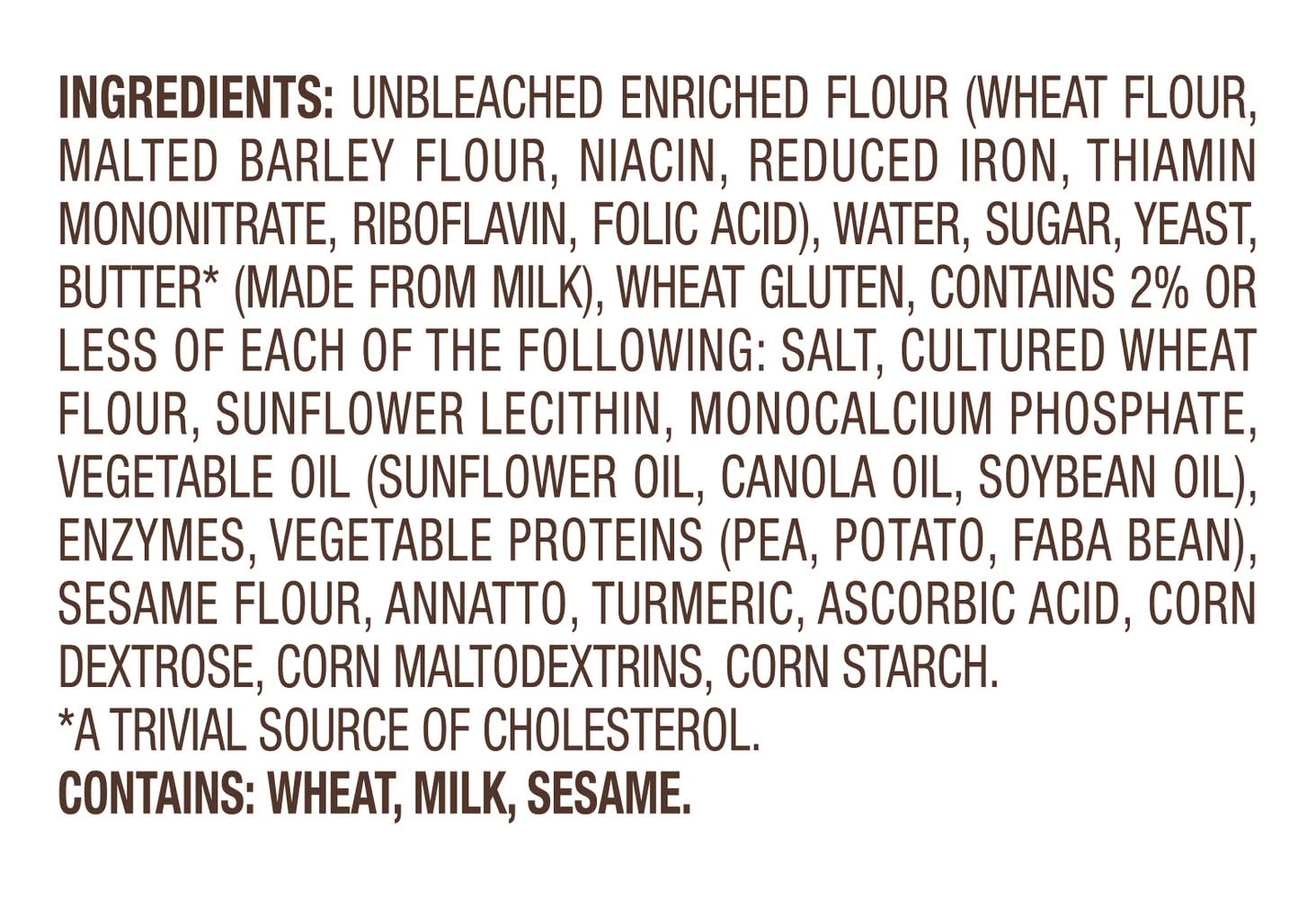 Ingredients: Unbleached Enriched Flour (Wheat Flour, Malted Barley Flour, Niacin, Reduced Iron, Thiamin Mononitrate, Riboflavin, Folic Acid), Water, Sugar, Yeast, Butter* (Made from Milk), Wheat Gluten, Contains 2% or Less of Each of the Following: Salt, Cultured Wheat Flour, Sunflower Lecithin, Monocalcium Phosphate, Vegetable Oil (Sunflower Oil, Canola Oil, Soybean Oil), Enzymes, Vegetable Proteins (Pea, Potato, Faba Bean), Sesame Flour, Annatto, Turmeric, Ascorbic Acid, Corn Dextrose, Corn Maltodextrins, Corn Starch. * a Trivial Source of Cholesterol Contains: Gluten, Milk, Soybeans, Wheat