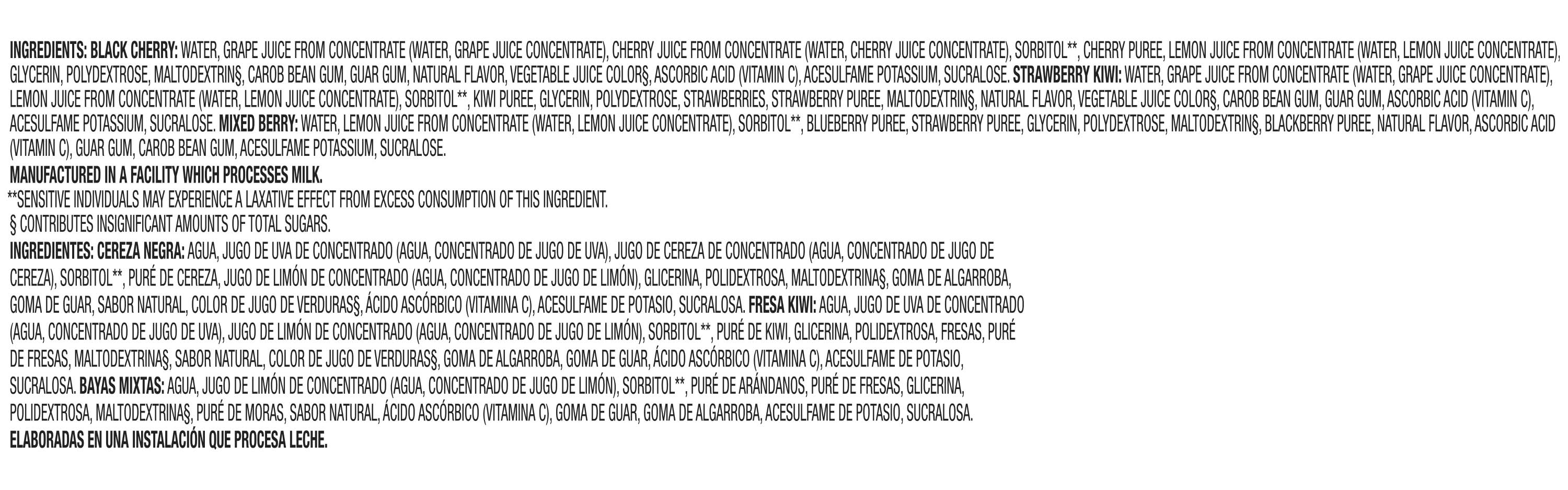 Ingredients: BLACK CHERRY: WATER, GRAPE JUICE FROM CONCENTRATE (WATER, GRAPE JUICE CONCENTRATE), CHERRY JUICE FROM CONCENTRATE (WATER, CHERRY JUICE CONCENTRATE), SORBITOL**, CHERRY PUREE, LEMON JUICE FROM CONCENTRATE (WATER, LEMON JUICE CONCENTRATE), GLYCERIN, POLYDEXTROSE, MALTODEXTRIN, CAROB BEAN GUM, NATURAL FLAVOR, VEGETABLE JUICE COLORS, ASCORBIC ACID (VITAMIN C), ACESULFAME POTASSIUM, SUCRALOSE. STRAWBERRY KIWI: WATER, GRAPE JUICE FROM CONCENTRATE (WATER, GRAPE JUICE CONCENTRATE), LEMON JUICE FROM CONCENTRATE (WATER, LEMON JUICE CONCENTRATE), SORBITOL**, KIWI PUREE, GLYCERIN, POLYDEXTROSE, STRAWBERRIES, STRAWBERRY PUREE, MALTODEXTRIN, NATURAL FLAVOR, VEGETABLE JUICE COLORS, CAROB BEAN GUM, GUAR GUM, ASCORBIC ACID (VITAMIN C), ACESULFAME POTASSIUM, SUCRALOSE.MIXED BERRY: WATER, LEMON JUICE FROM CONCENTRATE (WATER, LEMON JUICE CONCENTRATE), SORBITOL**, BLUEBERRY PUREE, STRAWBERRY PUREE, GLYCERIN, POLYDEXTROSE, MALTODEXTRIN, BLACKBERRY PUREE, NATURAL FLAVOR, ASCORBIC ACID (VITAMIN C), GUAR GUM, CAROB BEAN GUM, ACESULFAME POTASSIUM, SUCRALOSE. Contains: MANUFACTURED IN A FACILITY WHICH PROCESSES MILK.