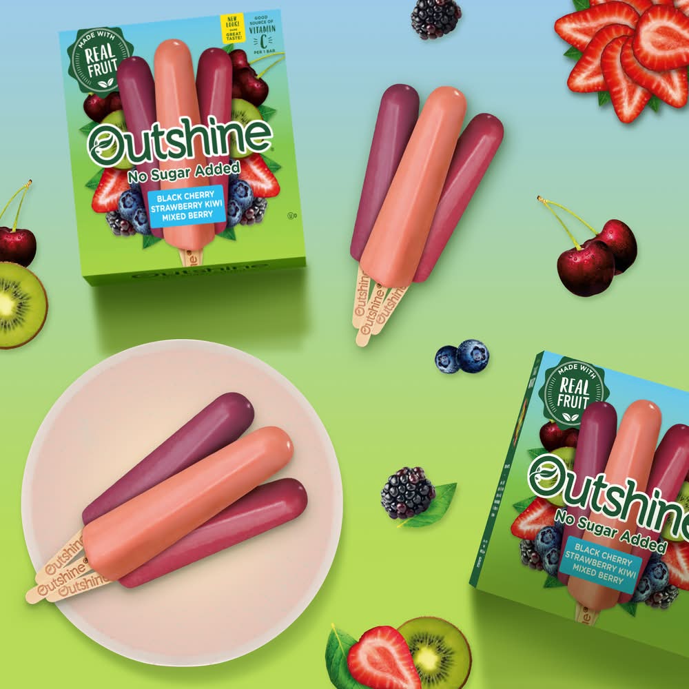 Outshine No Sugar Added Black Cherry, Strawberry Kiwi, and Mixed Berry Frozen Fruit Bars are a refreshing frozen snack bursting with three delicious tropical flavors. Made with real fruit, these gluten free fruit bars are a good source of Vitamin C for a great tasting snack. This tasty frozen snack contains no artificial flavors and no high fructose corn syrup. Enjoy these wholesome Outshine bars any time of day, whether you want a feel-good tropical snack or need a little afternoon pick-me-up. Outshine proudly offers refreshingly delicious frozen fruit bars for a snack that helps you shine brighter. Try the whole range of Outshine Frozen Fruit Bars to find your new favorite summertime snack or after-dinner delight. Choose from fruit bars, fruit bars with no sugar added, variety packs, and more. You can even mix and match your favorite Outshine Fruit Bars in a blender (remember to remove the sticks!) to make deliciously refreshing mocktails that are sure to cool down any hot afternoon. With many real fruit flavors to choose from including strawberry, black cherry, tangerine, mixed berry, and more, the possibilities are endless! • Flavor: Assorted • Nestle Dreyer's Ice Cream Company, Oakland, CA, 94618 • Packaging: Reusable