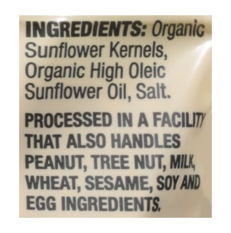 Ingredients: Organic Sunflowers Kernels, Organic High Oleic Sunflower Oil, Salt Contains: Peanuts, Tree Nuts, Milk, Wheat, Sesame, Soybeans, Eggs