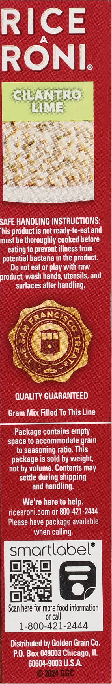 Rice with zesty cilantro lime seasoning. The San Francisco Treat. Making home made easy. Grain mix filled to this line. Package contains empty space to accommodate grain to seasoning ratio. This package is sold by weight, not by volume. Contents may settle during shipping and handling. Quality guaranteed. Delicious flavor in 90 sec. Make it meal by adding chicken and broccoli. • Flavor: Cilantro lime • Golden Grain Co, PO Box 049003 Chicago, IL 60604-9003 • Packaging: Reusable