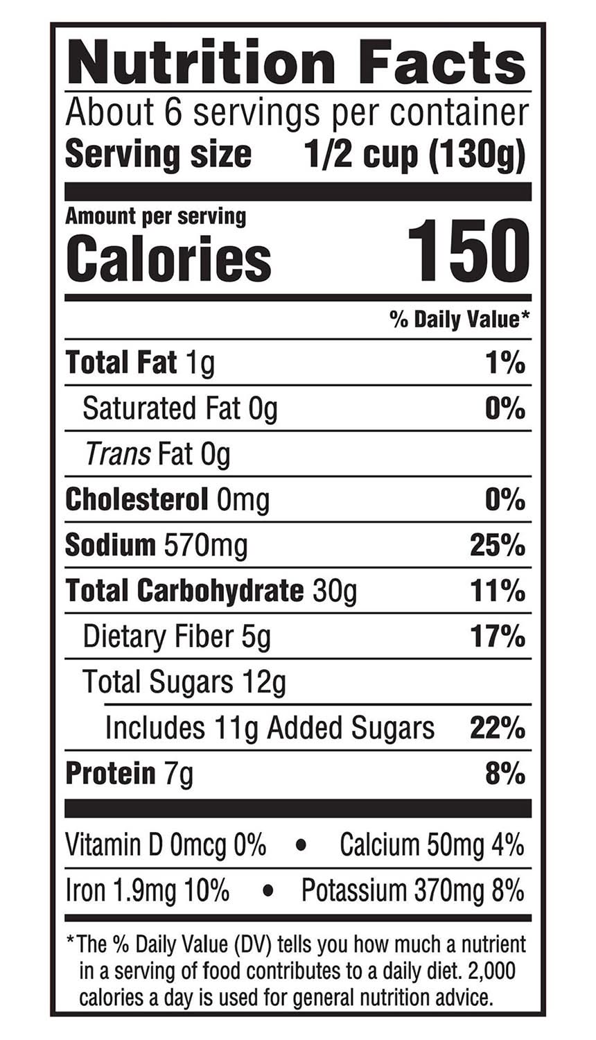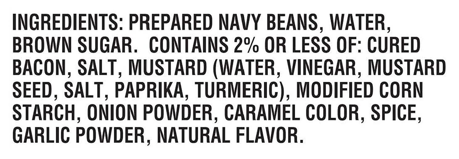 Ingredients: Prepared Navy Beans, Water, Brown Sugar. Contains 2% or Less of: Cured Bacon, Salt, Mustard (Water, Vinegar, Mustard Seed, Salt, Paprika, Turmeric), Modified Corn Starch, Onion Powder, Caramel Color, Spice, Garlic Powder, Natural Flavor Contains: Corn, Mustard