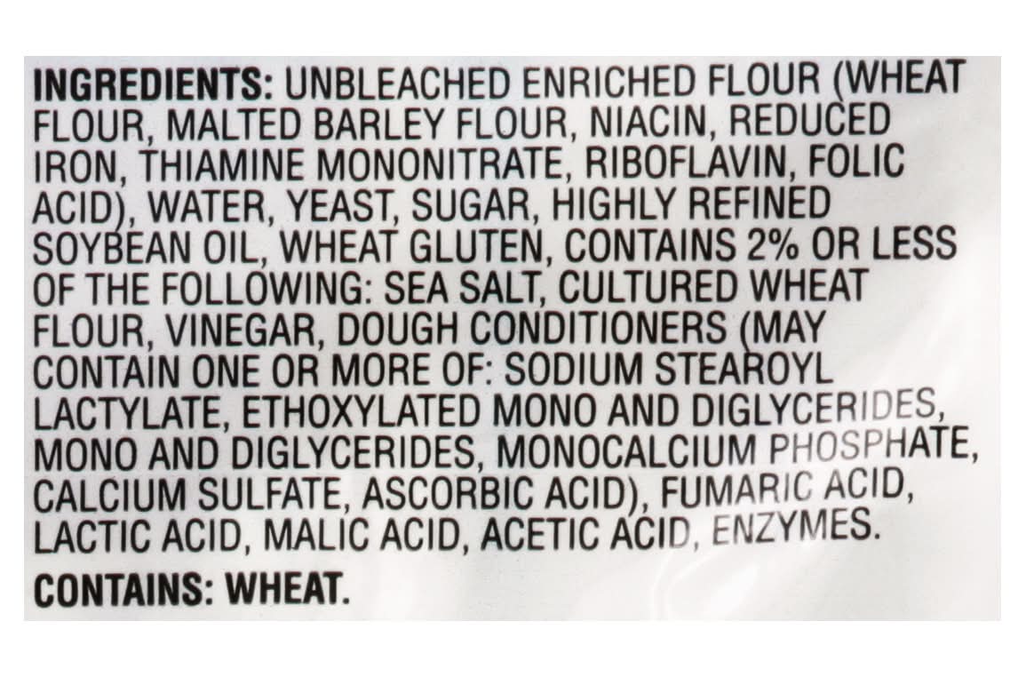 Ingredients: Unbleached Enriched Flour (Wheat Flour, Malted Barley Flour, Niacin, Reduced Iron, Thiamine Mononitrate, Riboflavin, Folic Acid), Water, Yeast, Sugar, Highly Refined Soybean Oil, Wheat Gluten, Contains 2% or Less of the Following: Sea Salt, Cultured Wheat Flour, Vinegar, Dough Conditioners (May Contain One or More of: Sodium Stearoyl Lactylate, Ethoxylated Mono and Diglycerides, Mono and Diglycerides, Monocalcium Phosphate, Calcium Sulfate, Ascorbic Acid), Fumaric Acid, Lactic Acid, Malic Acid, Acetic Acid, Enzymes. Contains: Wheat, Gluten, Soybeans