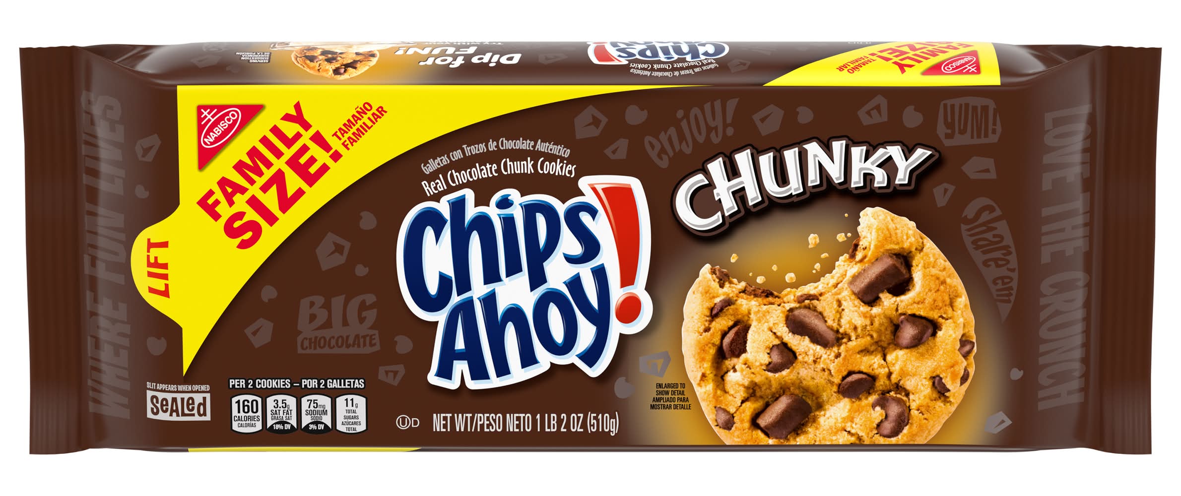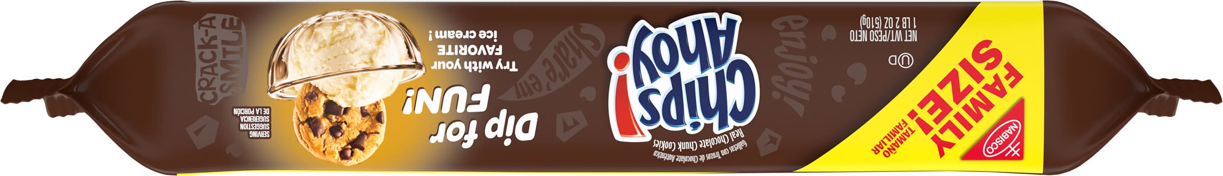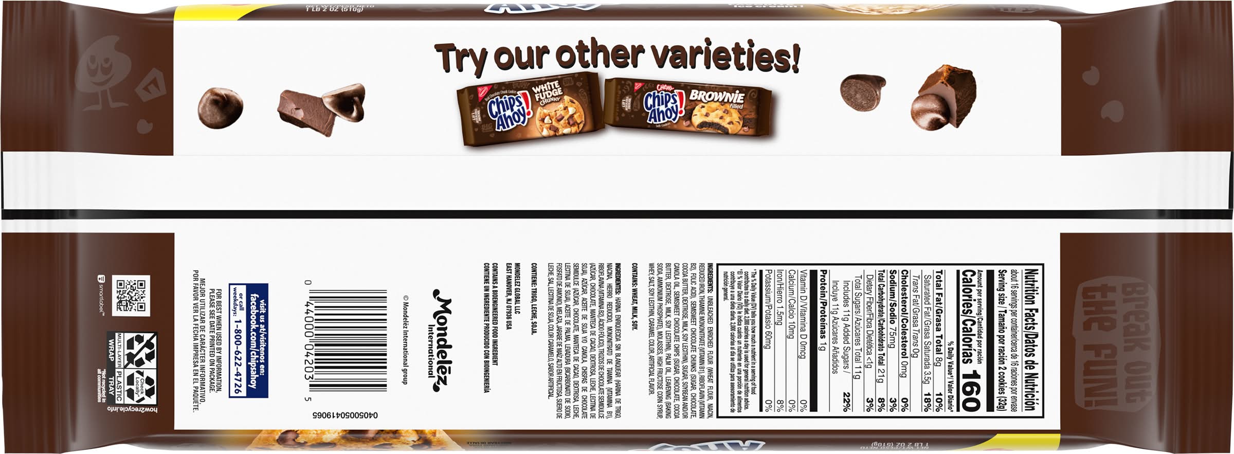 Ingredients: Unbleached Enriched Flour (Wheat Flour, Niacin, Reduced Iron, Thiamine Mononitrate {Vitamin B1}, Riboflavin {Vitamin B2}, Folic Acid), Semisweet Chocolate Chunks (Sugar, Chocolate, Cocoa Butter, Dextrose, Milk, Soy Lecithin), Sugar, Soybean and/or Canola Oil, Semisweet Chocolate Chips (Sugar, Chocolate, Cocoa Butter, Dextrose, Milk, Soy Lecithin), Palm Oil, Leavening (Baking Soda, Ammonium Phosphate), Molasses, High Fructose Corn Syrup, Whey, Salt, Soy Lecithin, Caramel Color, Artificial Flavor. Contains: Wheat, Milk, Soybeans, Corn