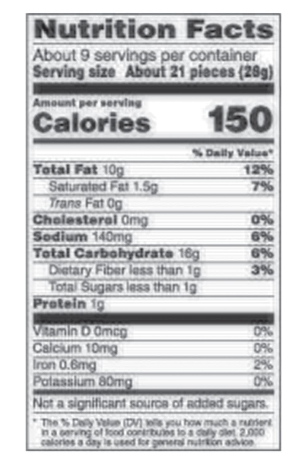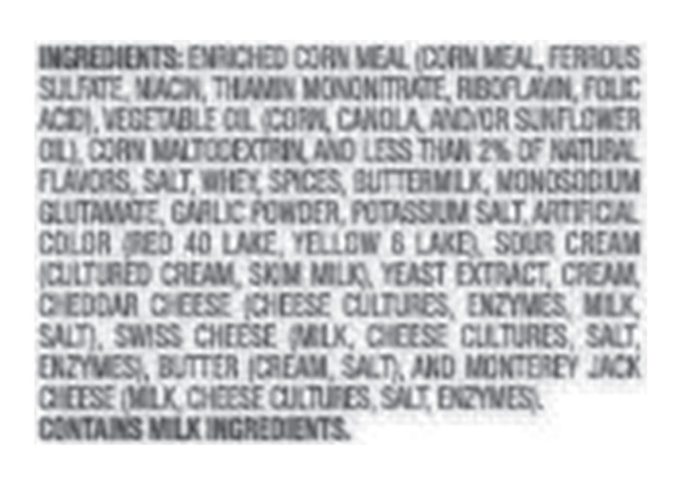 Ingredients: Enriched Corn Meal (Corn Meal, Ferrous Sulfate, Niacin, Thiamin Mononitrate, Riboflavin, Folic Acid), Vegetable Oil (Corn, Canola, and/or Sunflower Oil), Corn Maltodextrin, and Less than 2% of Natural Flavors, Salt, Whey, Spices, Buttermilk, Monosodium Glutamate, Garlic Powder, Potassium Salt, Artificial Color (Red 40 Lake, Yellow 6 Lake), Sour Cream (Cultured Cream, Skim Milk), Yeast Extract, Cream, Cheddar Cheese (Cheese Cultures, Enzymes, Milk, Salt), Swiss Cheese (Milk, Cheese Cultures, Salt, Enzymes), Butter (Cream, Salt), and Monterey Jack Cheese (Milk, Cheese Cultures, Salt, Enzymes) Contains: Milk
