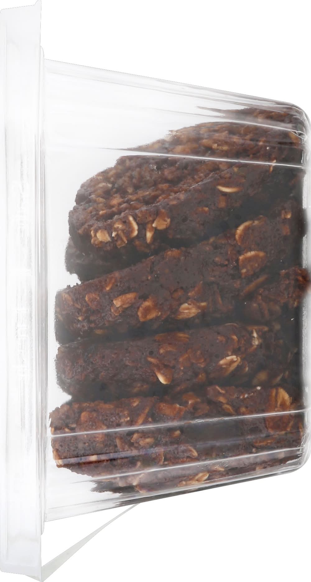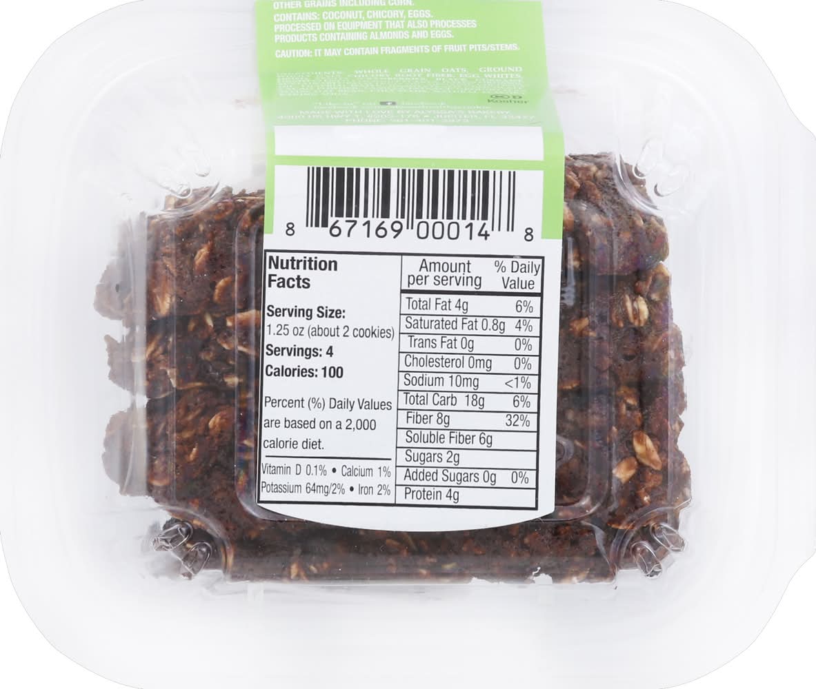 Ingredients: Whole Grain Oats, Ground Whole Oats, Chicory Root Fiber, Egg Whites, Dried Fruits (Cranberries, Black Currant, Unsweetened Coconut Flakes, Dates) Organic, Sustainable Palm Fruit Oil, Organic Coconut Oil, Filtered Water, Unsweetened Chocolate, Cacao Powder, Vanilla Extract, Ground Flax Seeds, Oat Bran, Chia Seeds, Natural Flavors, Baking Soda Contains: Eggs, Tree Nuts