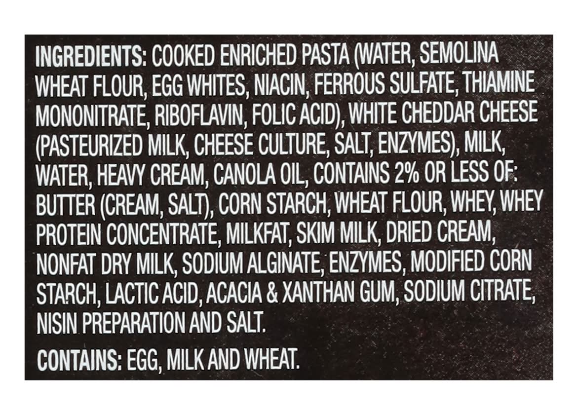 Ingredients: Cooked Enriched Pasta (Water, Semolina Wheat Flour, Egg Whites, Niacin, Ferrous Sulfate, Thiamine Mononitrate, Riboflavin, Folic Acid), White Cheddar Cheese (Pasteurized Milk, Cheese Culture, Salt, Enzymes), Milk, Water, Heavy Cream, Canola Oil, Contains 2% or Less of: Butter (Cream, Salt), Corn Starch, Wheat Flour, Whey, Whey Protein Concentrate, Milkfat, Skim Milk, Dried Cream, Nonfat Dry Milk, Sodium Alginate, Enzymes, Modified Corn Starch, Lactic Acid, Acacia & Xanthan Gum, Sodium Citrate, Nisin Preparation and Salt Contains: Eggs, Milk, Wheat, Corn