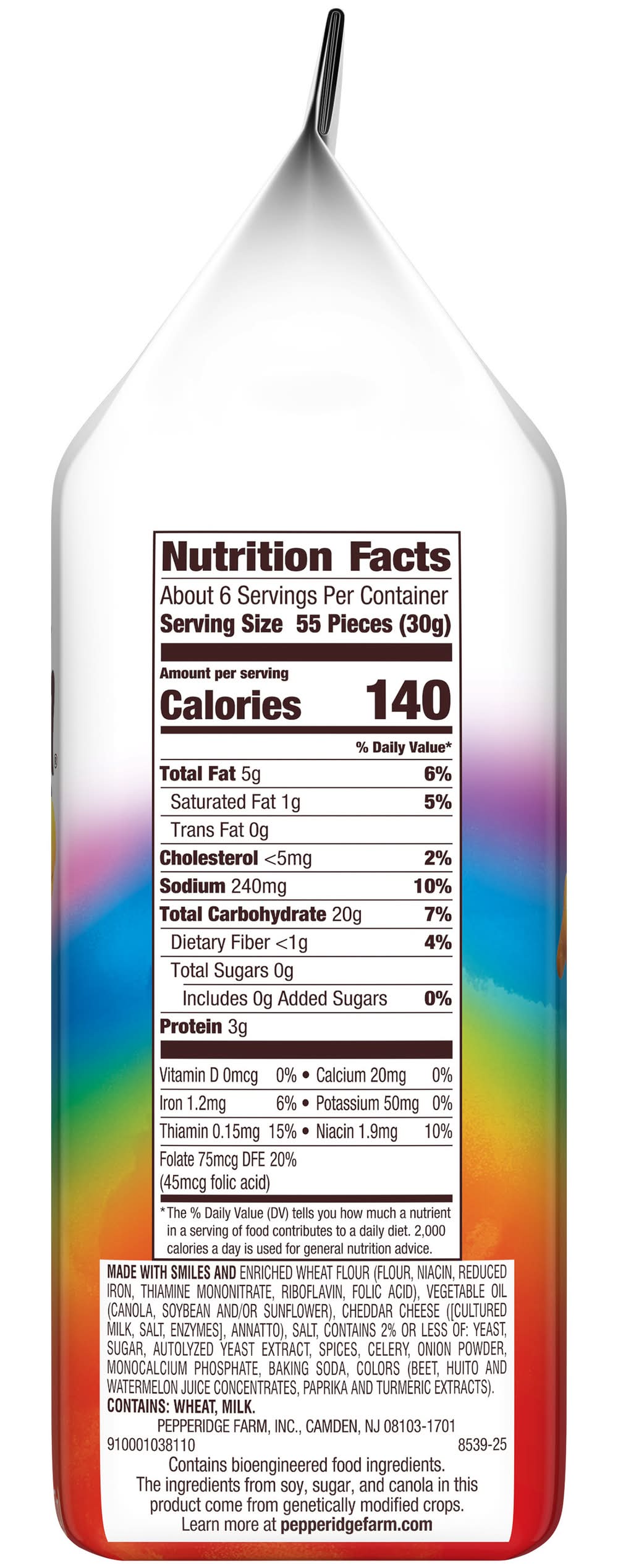 Ingredients: MADE WITH SMILES AND ENRICHED WHEAT FLOUR (FLOUR, NIACIN, REDUCED IRON, THIAMINE MONONITRATE, RIBOFLAVIN, FOLIC ACID), VEGETABLE OIL (CANOLA, SOYBEAN AND/OR SUNFLOWER), CHEDDAR CHEESE ([CULTURED MILK, SALT, ENZYMES], ANNATTO), SALT, CONTAINS 2% OR LESS OF: YEAST, SUGAR, AUTOLYZED YEAST EXTRACT, SPICES, CELERY, ONION POWDER, MONOCALCIUM PHOSPHATE, BAKING SODA, COLORS (BEET, HUITO AND WATERMELON JUICE CONCENTRATES, PAPRIKA AND TURMERIC EXTRACTS), . CONTAINS: WHEAT, MILK. Contains: CONTAINS: Gluten, Milk/Dairy, Wheat