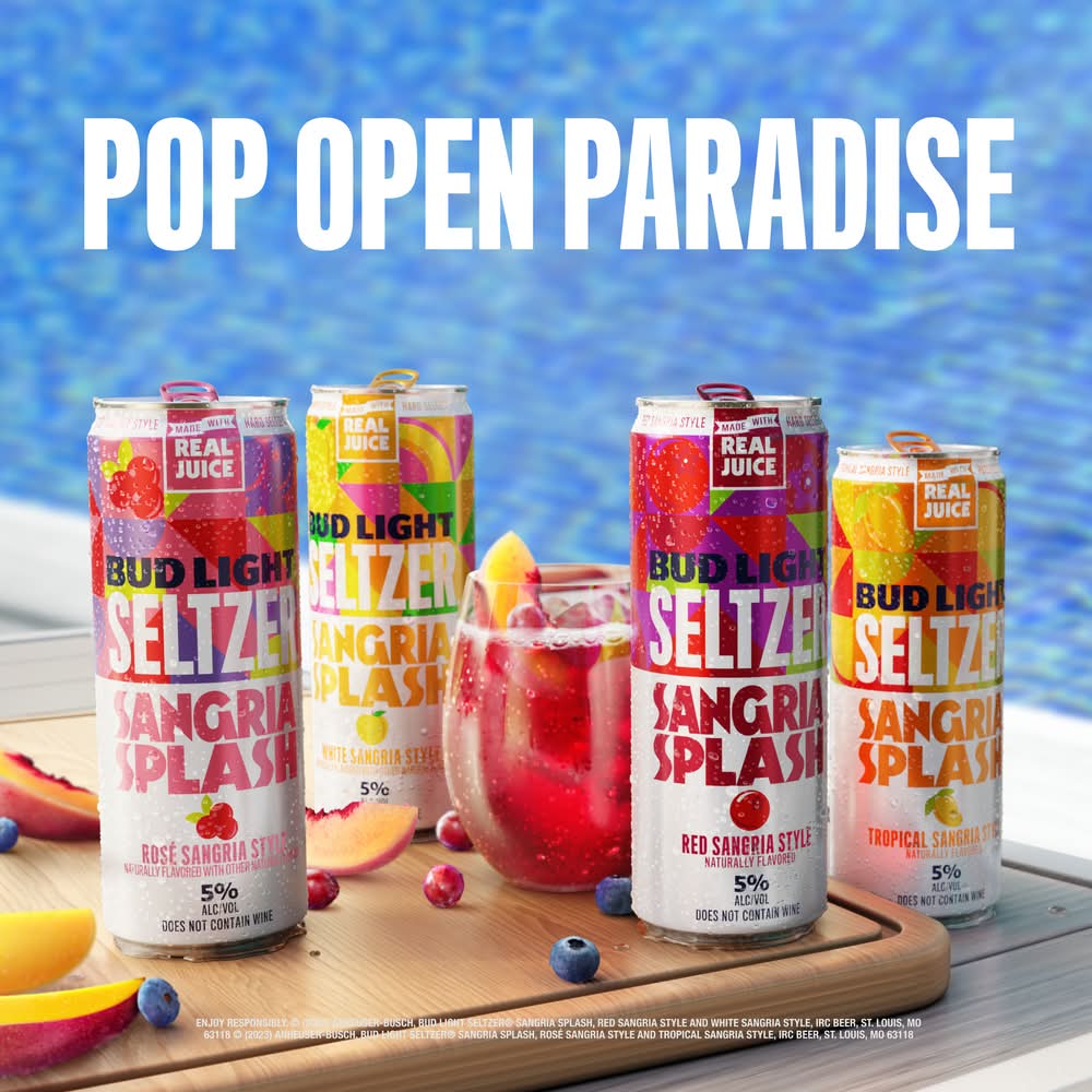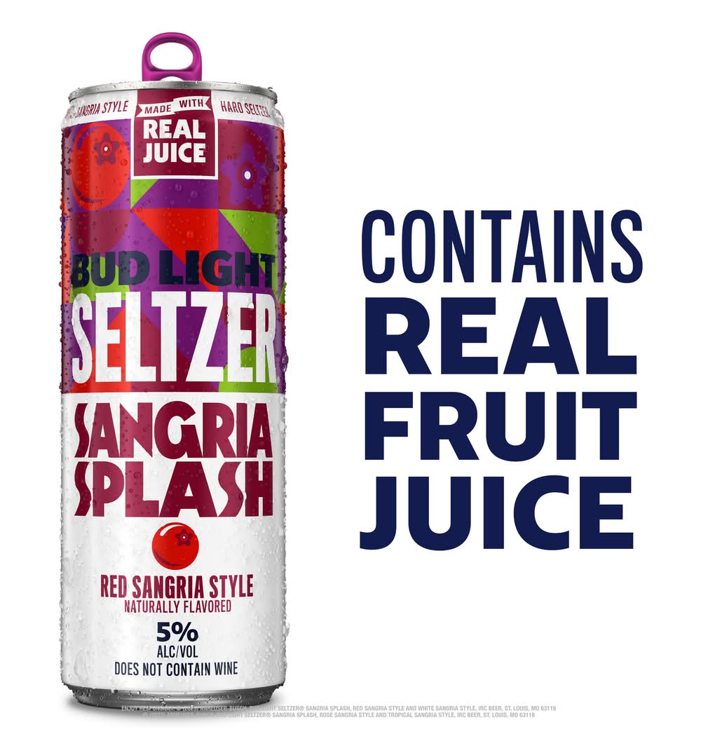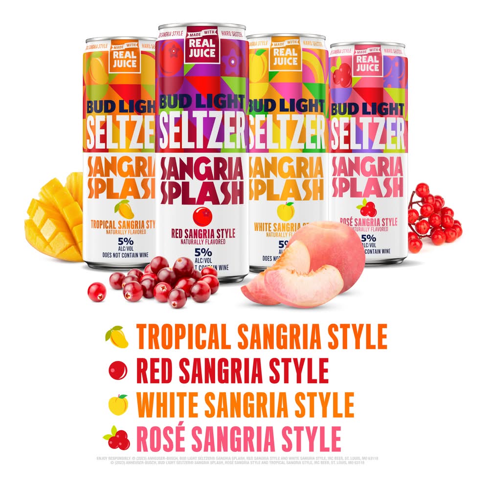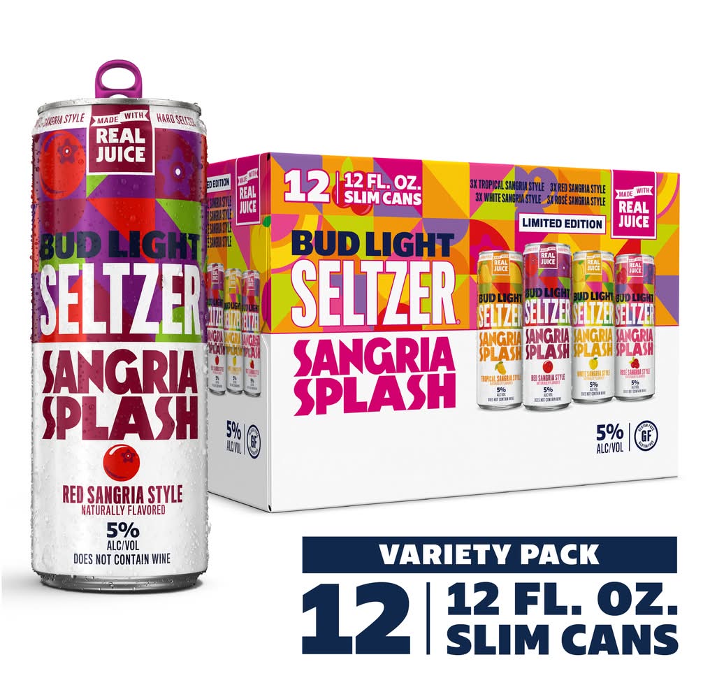 Pop open paradise with the all NEW limited time Bud Light Seltzer Sangria Splash Variety Pack. Available now in 12 fluid ounce cans with Red Sangria Style, White Sangria Style, Rosé Sangria Style and Tropical Sangria Style flavors. Give your tastebuds something to dance about. 100% Hard Seltzer, 0% Beer. • Flavor: Variety pack • Pack size: 12 • Alcohol by volume: 5% • Packaging: Reusable