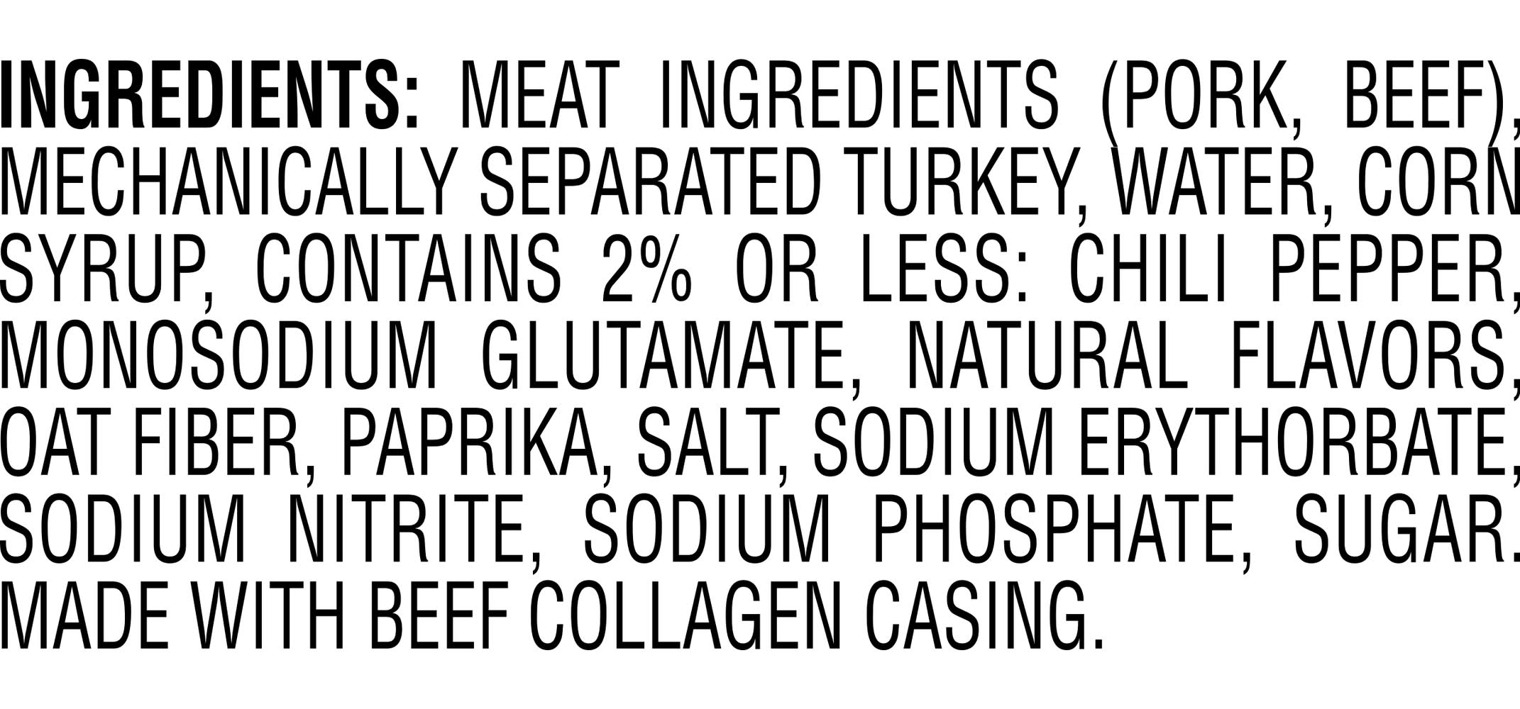 Ingredients: Meat Ingredients (Pork, Beef), Mechanically Separated Turkey, Water, Corn Syrup, Contains 2% or Less: Chili Pepper, Monosodium Glutamate, Natural Flavors, Oat Fiber, Paprika, Salt, Sodium Erythorbate, Sodium Nitrite, Sodium Phosphate, Sugar. Made with Beef Collagen Casing. Contains: Soy