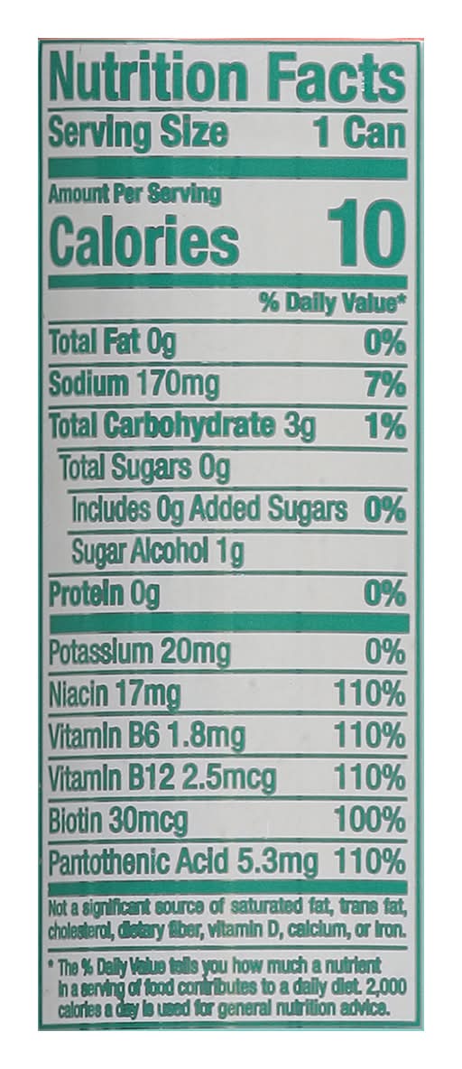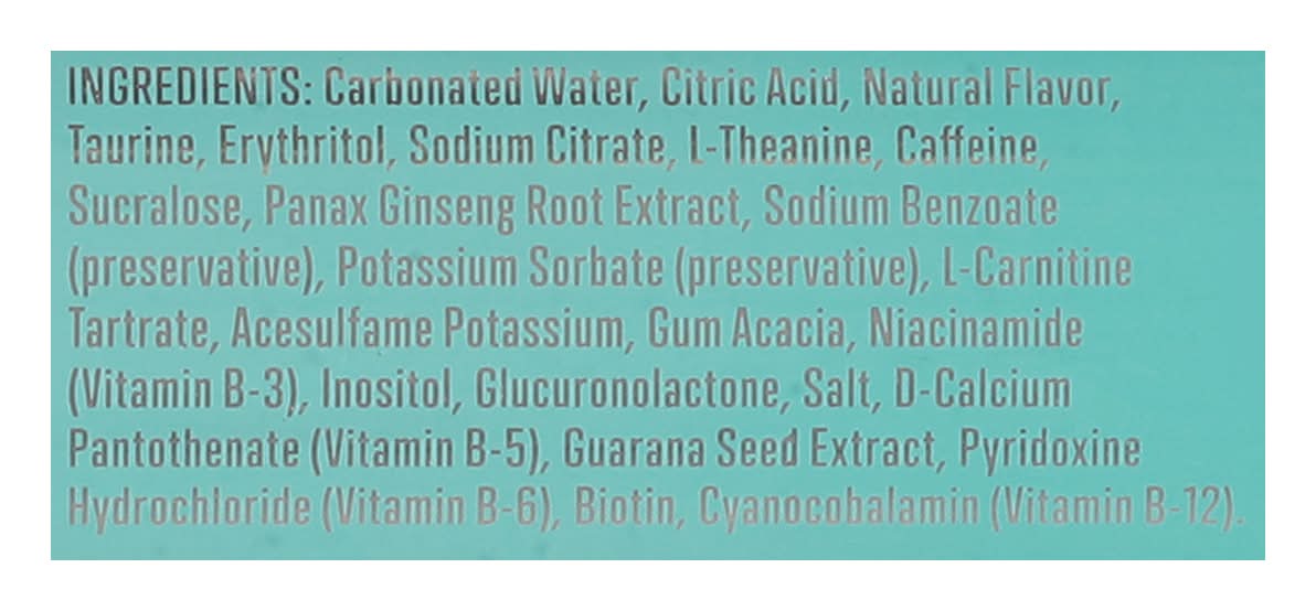 Ingredients: Carbonated Water Citric Acid Natural Flavor Taurine Erythritol Sodium Citrate L-Theanine Caffeine Sucralose Panax Ginseng Root Extract, Sodium Benzoate (Preservative) Potassium Sorbate (Preservative) L-Carnitine Tartrate Acesulfame Potassium Gum Acacia Niacinamide (Vitamin B-3), Inositol Glucuronolactone Salt D-Calcium Pantothenate (Vitamin B-5) Guarana Seed Extract Pyridoxine Hydrochloride (Vitamin B-6) Biotin Cyanocobalamin (Vitamin B-12) Contains 200mg of caffeine