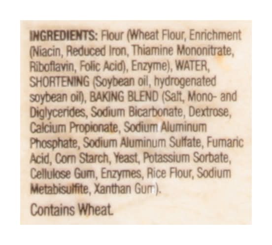 Ingredients: Flour (Wheat Flour, Enrichment (Niacin, Reduced Iron, Thiamine Mononitrate, Riboflavin, Folic Acid), Enzyme), Water, Shorting (Soybean Oil, Hydrogenated Soybean Oil), Baking Blend (Salt, Mono- and Diglycerides, Sodium Bicarbonate, Dextrose, Calcium Propionate, Sodium Aluminum Phosphate, Sodium Aluminum Sulfate, Fumaric Acid, Corn Starch, Yeast, Potassium Sorbate, Cellulose Gum, Enzymes, Rice Flour, Sodium Metabisulfite, Xanthan Gum) Contains: Wheat, Soybeans, Corn, Sulfites