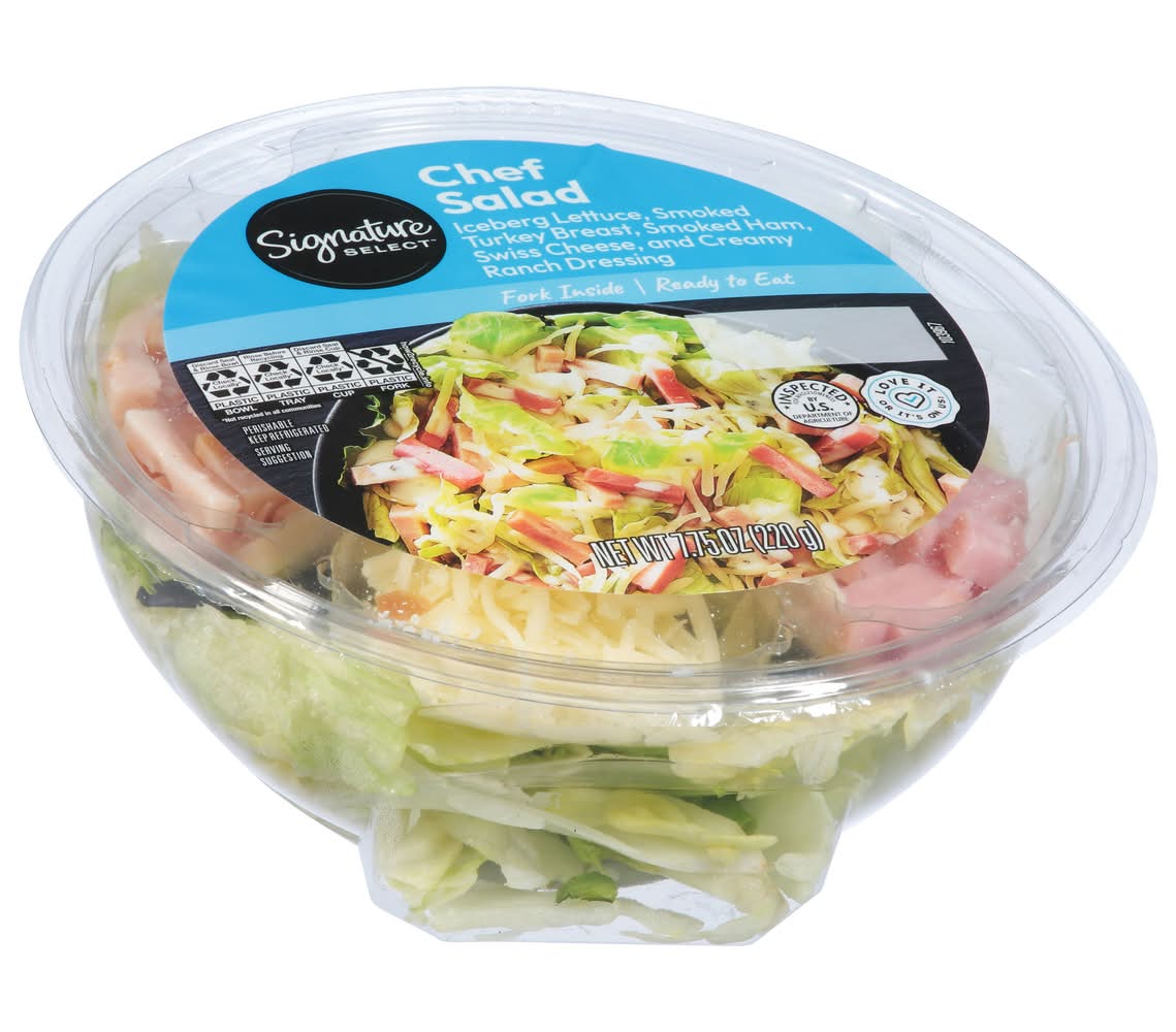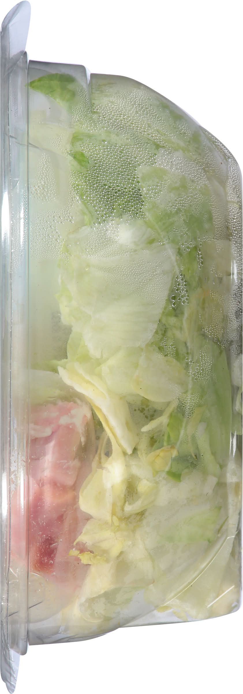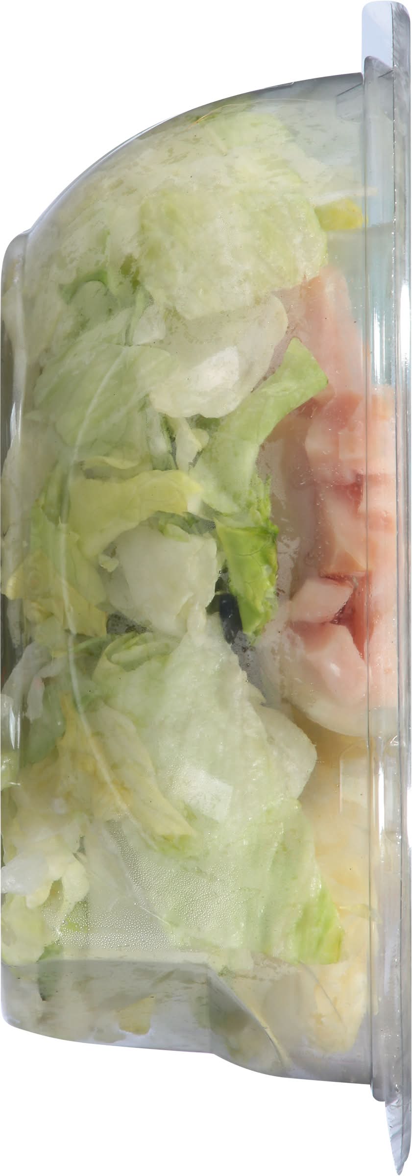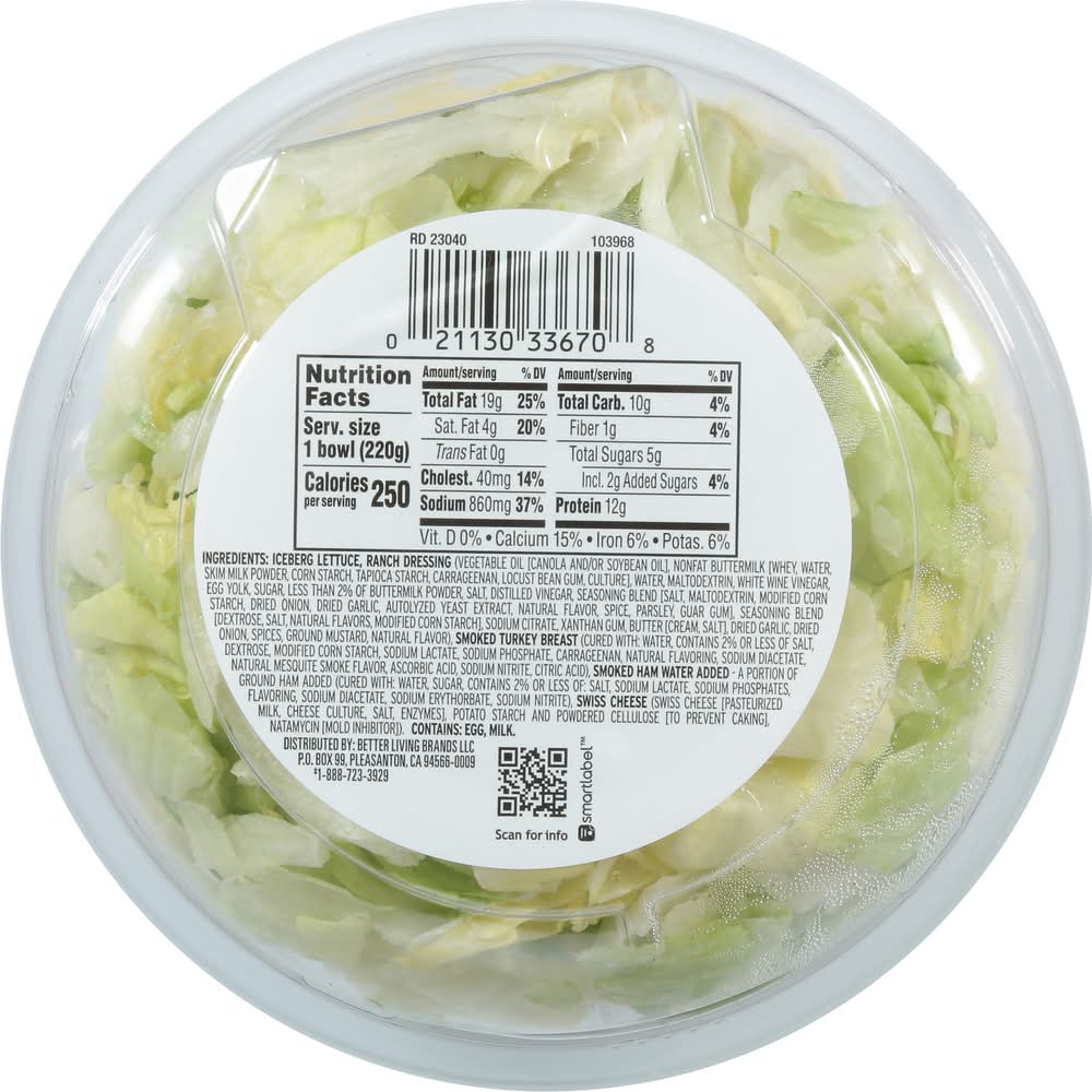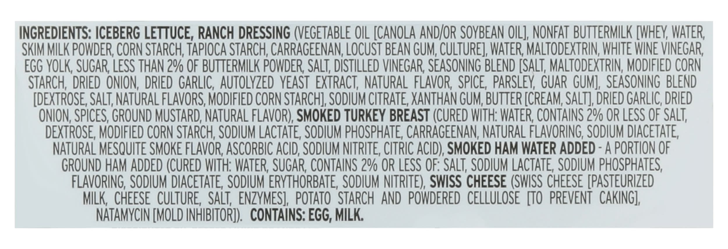 Ingredients: Iceberg Lettuce, Ranch Dressing (Vegetable Oil [Canola and/or Soybean Oil], Nonfat Buttermilk [Whey, Water, Skim Milk Powder, Corn Starch, Tapioca Starch, Carrageenan, Locust Bean Gum, Culture], Water, Maltodextrin, White Wine Vinegar, Egg Yolk, Sugar, Less than 2% of Buttermilk Powder, Salt, Distilled Vinegar, Seasoning Blend [Salt, Maltodextrin, Modified Corn Starch, Dried Onion, Dried Garlic, Autolyzed Yeast Extract, Natural Flavor, Spice, Parsley, Guar Gum], Seasoning Blend [Dextrose, Salt, Natural Flavors, Modified Corn Starch], Sodium Citrate, Xanthan Gum, Butter [Cream, Salt], Dried Garlic, Dried Onion, Spices, Ground Mustard, Natural Flavor), Smoked Turkey Breast (Cured with: Water, Contains 2% or Less of Salt, Dextrose, Modified Corn Starch, Sodium Lactate, Sodium Phosphate, Carrageenan, Natural Flavoring, Sodium Diacetate, Natural Mesquite Smoke Flavor, Ascorbic Acid, Sodium Nitrite, Citric Acid), Smoked Ham Water Added-a Portion of Ground Ham Added (Cured with: Water, Sugar, Contains 2% or Less of: Salt, Sodium Lactate, Sodium Phosphates, Flavoring, Sodium Diacetate, Sodium Erythorbate, Sodium Nitrite), Swiss Cheese (Swiss Cheese [Pasteurized Milk, Cheese Culture, Salt, Enzymes], Potato Starch and Powdered Cellulose [to Prevent Caking), Natamycin [Mold Inhibitor]). Contains: Eggs, Milk, Corn, Mustard, Soybeans