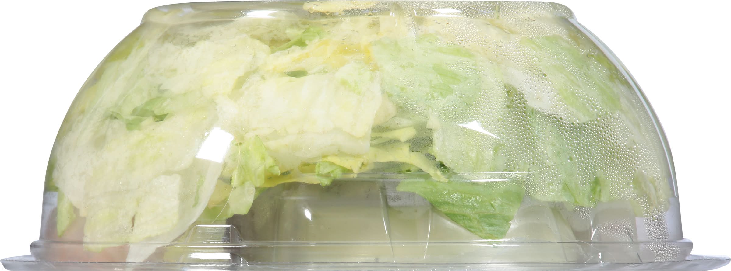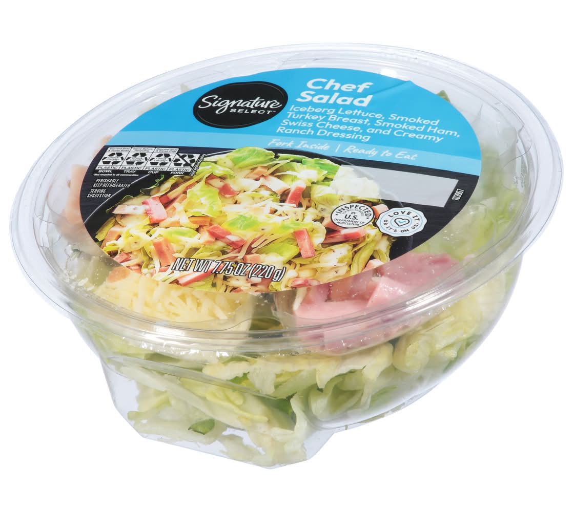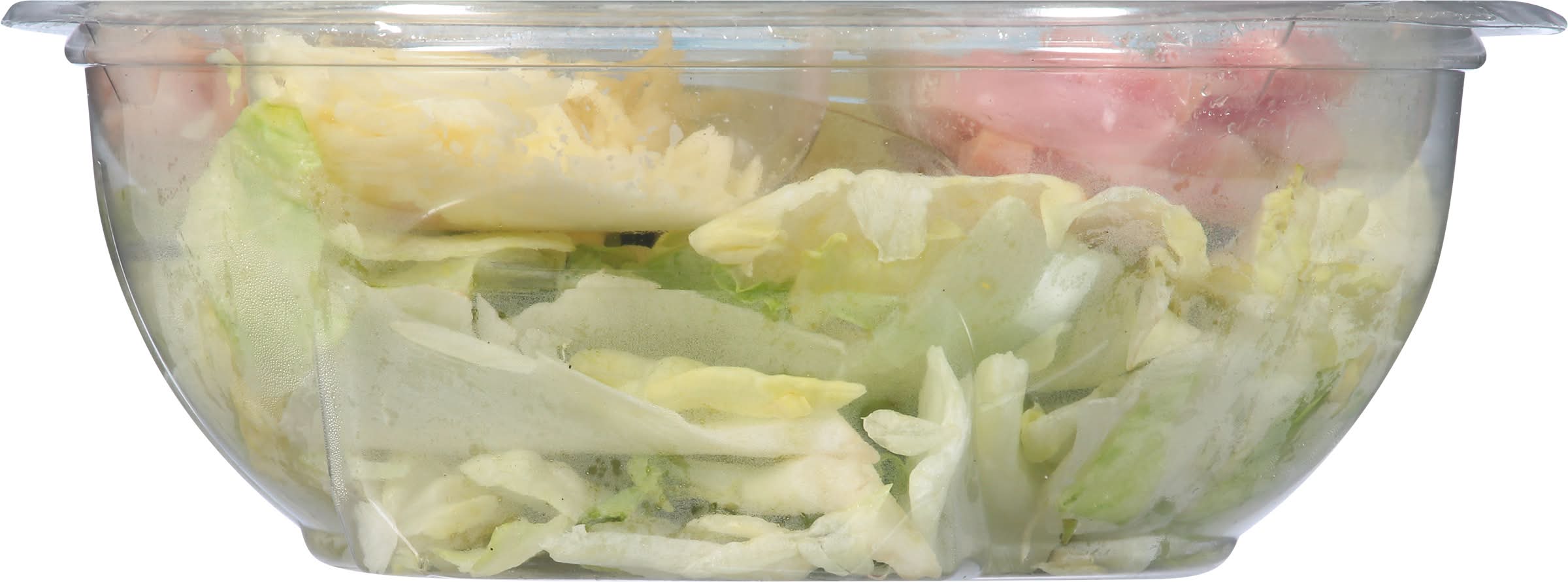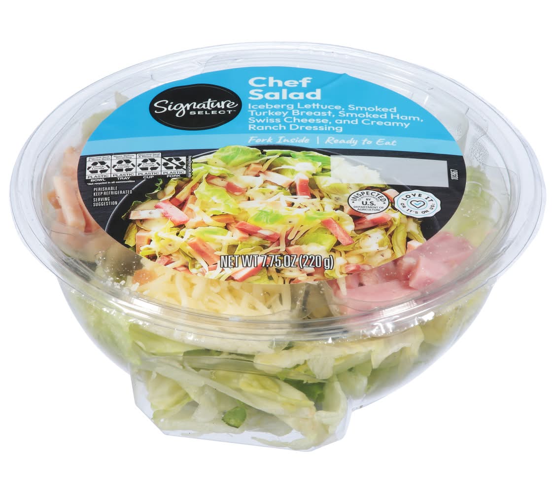 Ingredients: Iceberg Lettuce, Ranch Dressing (Vegetable Oil [Canola and/or Soybean Oil], Nonfat Buttermilk [Whey, Water, Skim Milk Powder, Corn Starch, Tapioca Starch, Carrageenan, Locust Bean Gum, Culture], Water, Maltodextrin, White Wine Vinegar, Egg Yolk, Sugar, Less than 2% of Buttermilk Powder, Salt, Distilled Vinegar, Seasoning Blend [Salt, Maltodextrin, Modified Corn Starch, Dried Onion, Dried Garlic, Autolyzed Yeast Extract, Natural Flavor, Spice, Parsley, Guar Gum], Seasoning Blend [Dextrose, Salt, Natural Flavors, Modified Corn Starch], Sodium Citrate, Xanthan Gum, Butter [Cream, Salt], Dried Garlic, Dried Onion, Spices, Ground Mustard, Natural Flavor), Smoked Turkey Breast (Cured with: Water, Contains 2% or Less of Salt, Dextrose, Modified Corn Starch, Sodium Lactate, Sodium Phosphate, Carrageenan, Natural Flavoring, Sodium Diacetate, Natural Mesquite Smoke Flavor, Ascorbic Acid, Sodium Nitrite, Citric Acid), Smoked Ham Water Added-a Portion of Ground Ham Added (Cured with: Water, Sugar, Contains 2% or Less of: Salt, Sodium Lactate, Sodium Phosphates, Flavoring, Sodium Diacetate, Sodium Erythorbate, Sodium Nitrite), Swiss Cheese (Swiss Cheese [Pasteurized Milk, Cheese Culture, Salt, Enzymes], Potato Starch and Powdered Cellulose [to Prevent Caking), Natamycin [Mold Inhibitor]). Contains: Eggs, Milk, Corn, Mustard, Soybeans