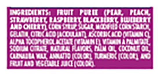 Ingredients: Fruit Puree (Pear, Peach, Strawberry, Raspberry, Blackberry, Blueberry and Cherry), Corn Syrup, Sugar, Modified Corn Starch, Gelatin, Citric Acid (Acidulant), Ascorbic Acid (Vitamin C), Alpha Tocopherol Acetate (Vitamin E), Vitamin A Palmitate, Sodium Citrate, Natural Flavors, Palm Oil, Coconut Oil, Carnauba Wax, Annatto (Color), Turmeric (Color), and Fruit and Vegetable Juice (Color) Contains: Tree Nuts