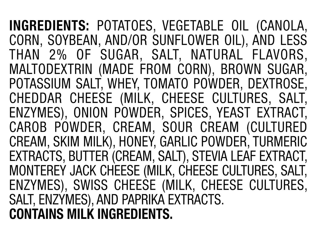 Ingredients: Potatoes, Vegetable Oil (Canola, Corn, Soybean, and/or Sunflower Oil), and Less than 2% of Sugar, Salt, Natural Flavors, Maltodextrin (Made from Corn), Brown Sugar, Potassium Salt, Whey, Tomato Powder, Dextrose, Cheddar Cheese (Milk, Cheese Cultures, Salt, Enzymes), Onion Powder, Spices, Yeast Extract, Carob Powder, Cream, Sour Cream (Cultured Cream, Skim Milk), Honey, Garlic Powder, Turmeric Extracts, Butter (Cream, Salt), Stevia Leaf Extract, Monterey Jack Cheese (Milk, Cheese Cultures, Salt, Enzymes), Swiss Cheese (Milk, Cheese Cultures, Salt, Enzymes), and Paprika Extracts Contains: Milk, Soybeans