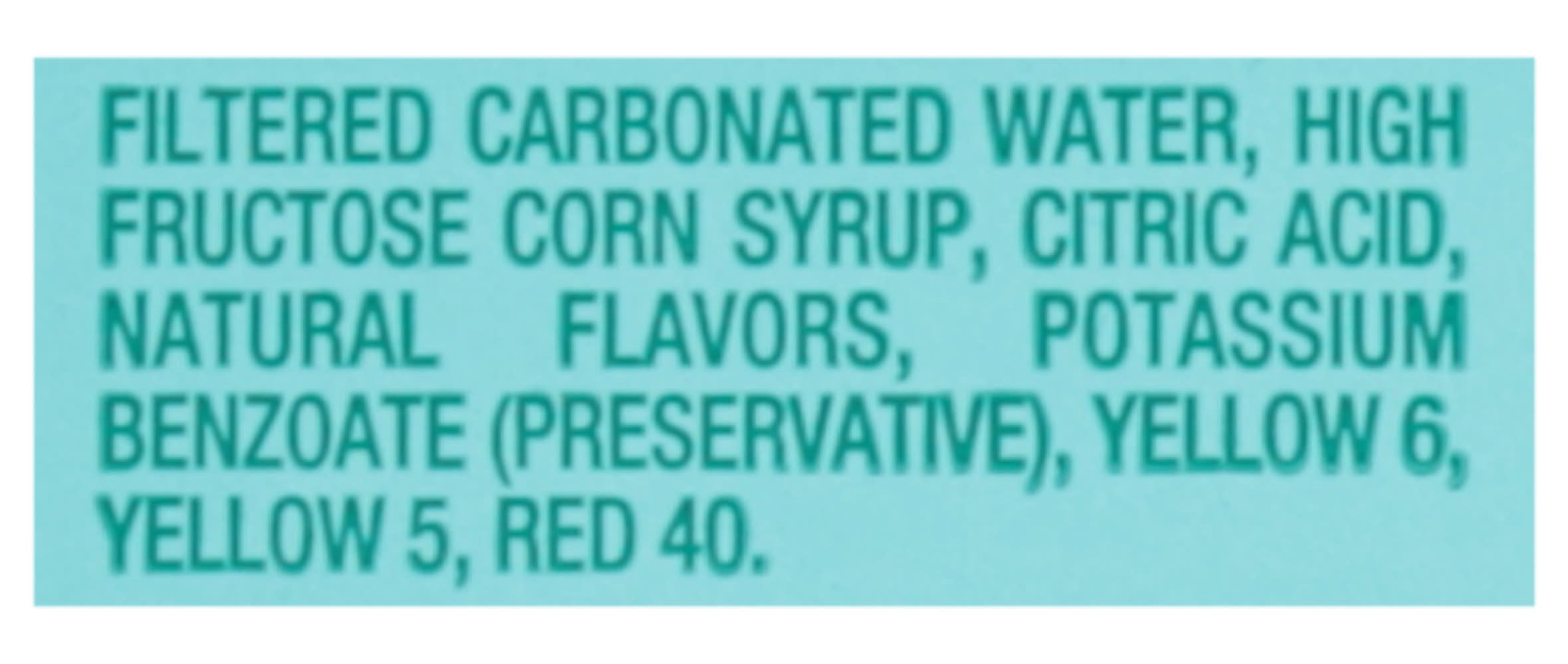 Ingredients: Filtered Carbonated Water, High Fructose Corn Syrup, Citric Acid, Natural Flavors, Potassium Benzoate (Preservative), Yellow 6, Yellow 5, Red 40