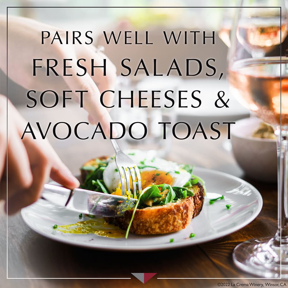 Crisp and clean with sweet aromas and delicate berry flavors. A medium bodied La Crema wine, this opulent, yet approachable rose Pinot Noir wine presents aromas of strawberry, white raspberry and mandarin orange followed by flavors of cran-raspberry, blood orange and flinty minerality. This California wine bottle features a screw cap closure to ensure freshness. Crafted with boutique winemaking techniques and fermented in stainless steel tanks at cool temperatures to preserve fresh fruit characteristics, this blush wine offers vibrant aromas and flavors to deliver a unique wine drinking experience. The 2023 vintage of this received 91 points and Editor’s Choice from Wine Enthusiast’s Matt Kettmann in October 2024. Pair this expressive California wine with soft cheeses, grilled vegetables and Impossible burgers. Sourced from select vineyards in Monterey, California, this pink wine is an easy-drinking wine with unique, elegant cool-climate qualities that can be enjoyed year-round. From the vine to the glass, every step of the La Crema winemaking process seeks to preserve the Rose’s flavors. La Crema’s original name, means “best of the vine,” setting the standard for all La Crema has done since 1979. La Crema is committed to sustainability. This bottled wine has a 13.5% ABV. • Alcohol by volume: 13.5% • 2023