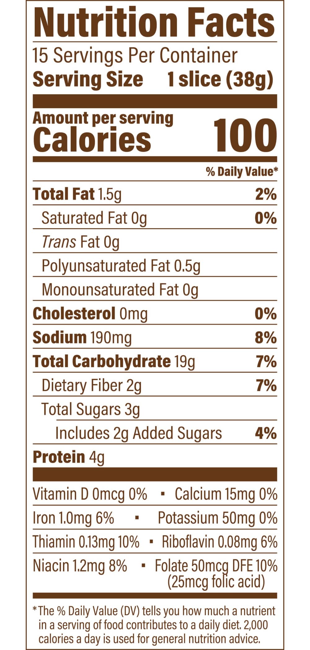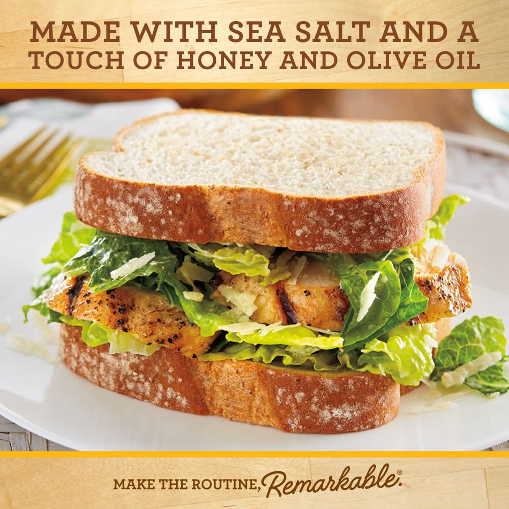 Ingredients: ENRICHED WHEAT FLOUR [FLOUR, MALTED BARLEY FLOUR, REDUCED IRON, NIACIN, THIAMIN MONONITRATE, RIBOFLAVIN, FOLIC ACID], WATER, WHOLE WHEAT FLOUR, SUGAR, WHEAT GLUTEN, YEAST, VEGETABLE OIL (SOYBEAN), SEA SALT, HONEY, WHEAT BRAN, CONTAINS 0.5% OR LESS OF EACH OF THE FOLLOWING: [CULTURED WHEAT FLOUR, SOY LECITHIN, NATURAL FLAVORS, CITRIC ACID, GRAIN VINEGAR], . Contains: Wheat, Soybeans, Milk, Tree Nuts, Sesame