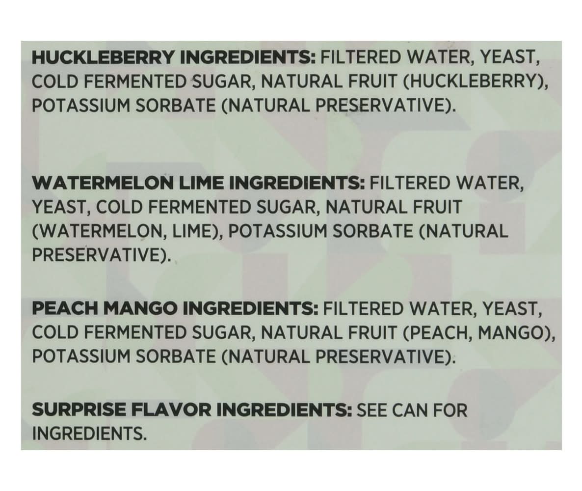 Ingredients: Huckleberry Ingredients: Filtered Water, Yeast, Cold Fermented Sugar, Natural Fruit (Huckleberry), Potassium Sorbate (Natural Preservative). Watermelon Lime Ingredients: Filtered Water, Yeast, Cold Fermented Sugar, Natural Fruit (Watermelon, Lime), Potassium Sorbate (Natural Preservative). Peach Mango Ingredients: Filtered Water, Yeast, Cold Fermented Sugar, Natural Fruit (Peach, Mango), Potassium Sorbate (Natural Preservative). Surprise Flavor Ingredients: See Can for Ingredients