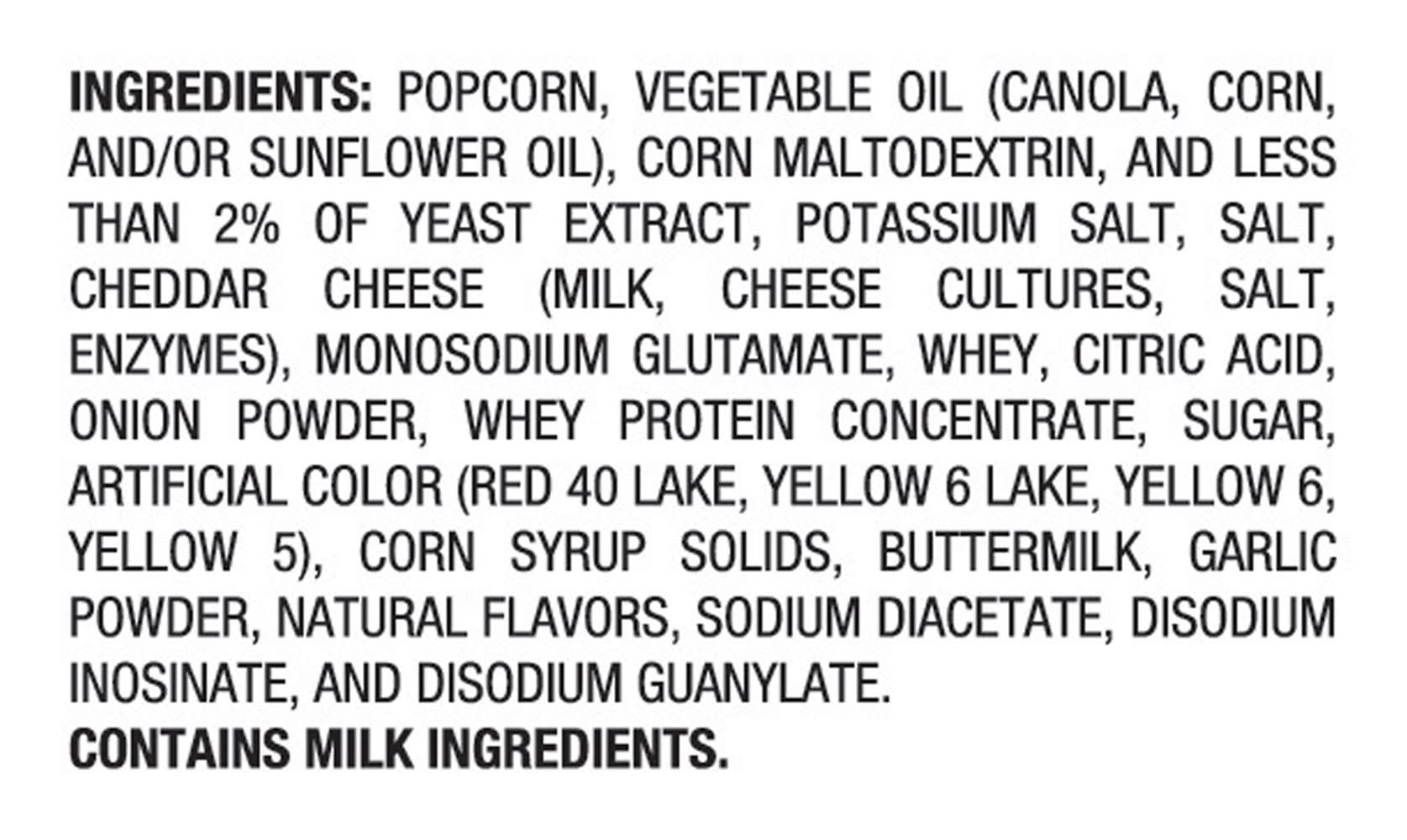 Ingredients: Popcorn, Vegetable Oil (Canola, Corn, and/or Sunflower Oil), Corn Maltodextrin, and Less than 2% of Yeast Extract, Potassium Salt, Salt, Cheddar Cheese (Milk, Cheese Cultures, Salt, Enzymes), Monosodium Glutamate, Whey, Citric Acid, Onion Powder, Whey Protein Concentrate, Sugar, Artificial Color (Red 40 Lake, Yellow 6 Lake, Yellow 6, Yellow 5), Corn Syrup Solids, Buttermilk, Garlic Powder, Natural Flavors, Sodium Diacetate, Disodium Inosinate, and Disodium Guanylate Contains: Milk