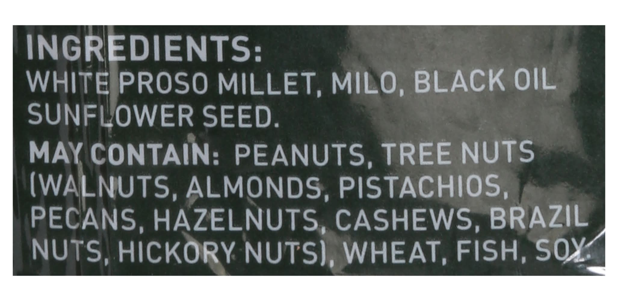 Ingredients: White Proso Millet, Milo, Black Oil Sunflower Seed. Contains: 'May Contain Peanuts', 'May Contain Tree Nuts', 'May Contain Fish', 'May Contain Soybeans', 'May Contain Wheat'