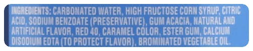 Ingredients: Carbonated Water, High Fructose Corn Syrup, Citric Acid, Sodium Benzoate (Preservative), Gum Acacia, Natural and Artificial Flavor, Red 40, Caramel Color, Ester Gum, Calcium Disodium EDTA (to Protect Flavor), Brominated Vegetable Oil.