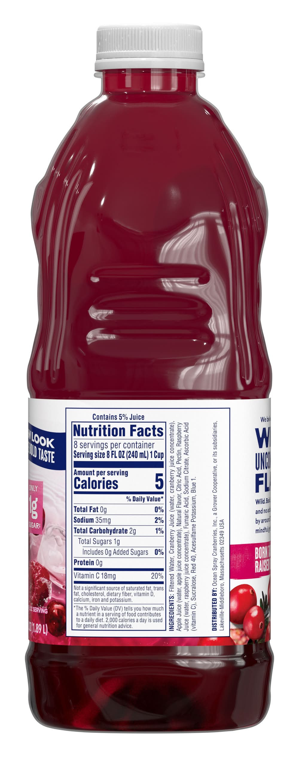 Ingredients: Filtered Water, Cranberry Juice (Water, Cranberry Juice Concentrate), Apple Juice (Water, Apple Juice Concentrate), Natural Flavor, Citric Acid, Pectin, Raspberry Juice (Water, Raspberry Juice Concentrate), Fumaric Acid, Sodium Citrate, Ascorbic Acid (Vitamin C), Sucralose, Red 40, Acesulfame Potassium, Blue 1