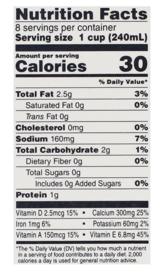 Ingredients: Almond Blend (Filtered Water, Almonds), Sugar, Calcium Carbonate, Sea Salt, Natural Flavor, Locust Bean Gum, Gellan Gum, Sunflower Lecithin, Vitamin E Acetate, Vitamin A Palmitate, Vitamin D2. Contains: Tree Nuts