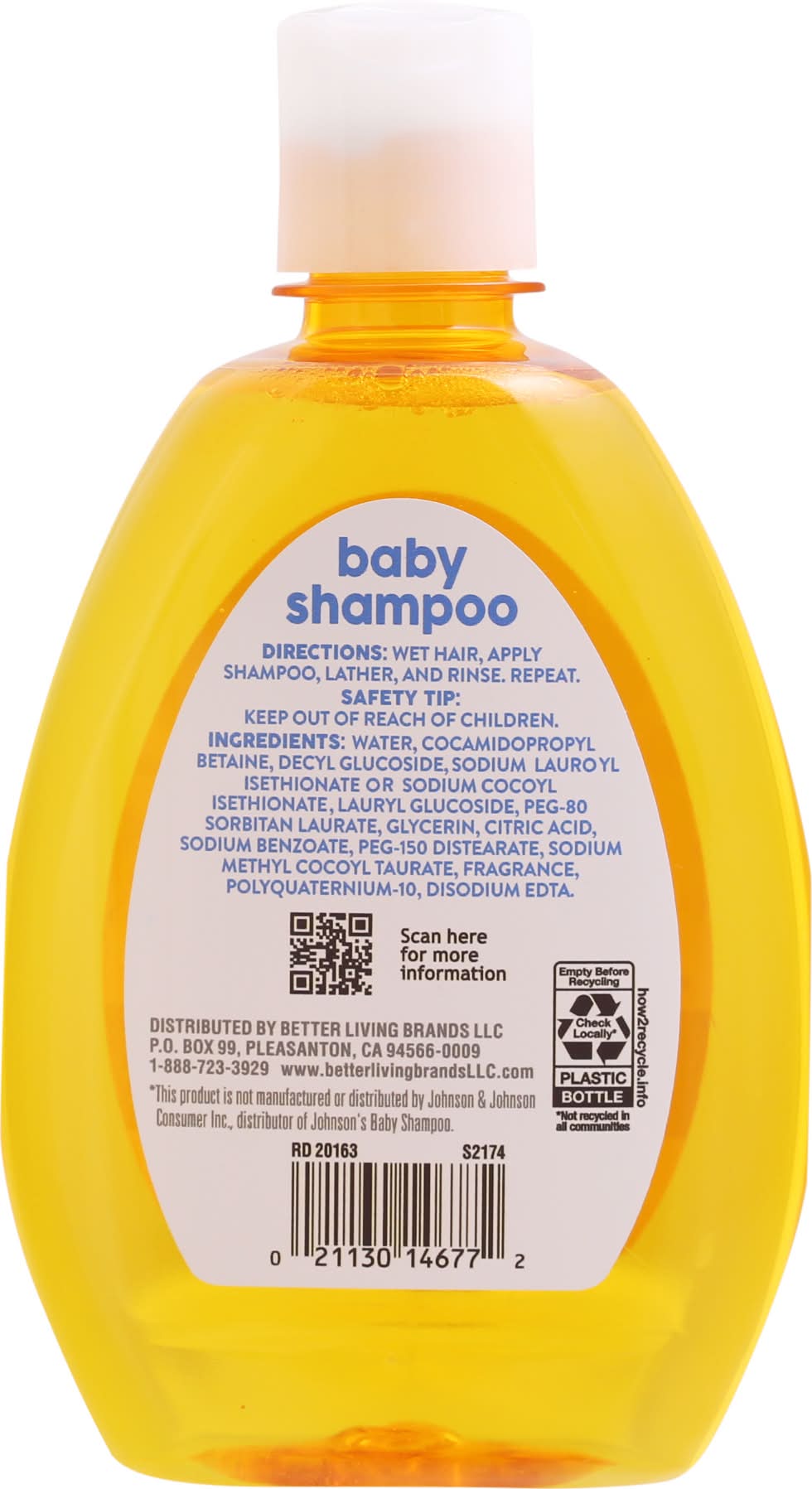 Compare to Johnson's Baby Shampoo (This product is not manufactured or distributed by Johnson & Johnson Consumer Inc., Distributor of Johnson's Baby Shampoo). Phenoxyethanol free, sulfate free, dye free, paraben free, phthalate free & quaternium 15 free. Gentle an effective. Quality guaranteed. www.betterlivingbrandsLLC.com. how2recycle.info. Scan for more information. • Better Living Brands LLC, P.O. Box 99,Pleasanton,CA,94566-0009 • Packaging: Reusable