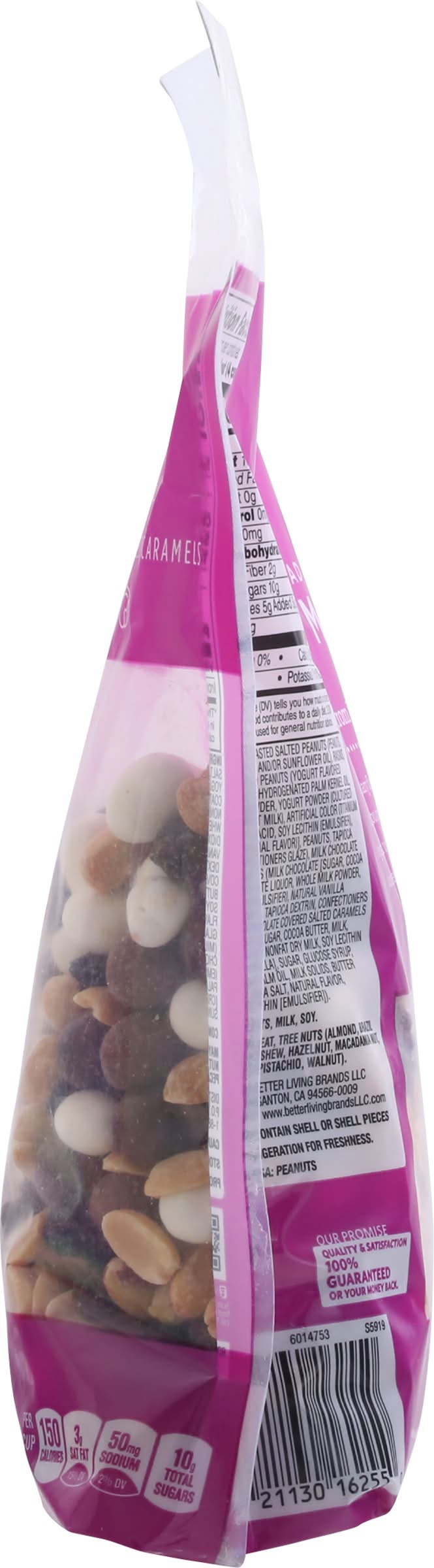 Ingredients: Roasted Salted Peanuts (Peanuts, Salt, Safflower and/or Sunflower Oil), Raisins, Yogurt Covered Peanuts (Yogurt Flavored Coating [Sugar, Hydrogenated Palm Kernel Oil, Nonfat Milk Powder, Yogurt Powder {Cultured Whey and Nonfat Milk}, Artificial Color {Titanium Dioxide}, Lactic Acid, Soy Lecithin {Emulsifier}, Vanillin {Artificial Flavor}], Peanuts, Tapioca Dextrin, Confectioners Glaze), Milk Chocolate Covered Peanuts (Milk Chocolate [Sugar, Cocoa Butter, Chocolate Liquor, Whole Milk Powder, Soy Lecithin {Emulsifier}, Natural Vanilla Flavor], Peanuts, Tapioca Dextrin, Confectioners Glaze), Milk Chocolate Covered Salted Caramels (Milk Chocolate [Sugar, Cocoa Butter, Milk, Chocolate Liquor, Nonfat Dry Milk, Soy Lecithin {Emulsifier}, Vanilla], Sugar, Glucose Syrup, Palm Kernel & Palm Oil, Milk Solids, Butter [Cream, Salt], Sea Salt, Natural Flavor, Sunflower Lecithin [Emulsifier]). Contains: Peanuts, Milk, Soybeans, Wheat, Tree Nuts