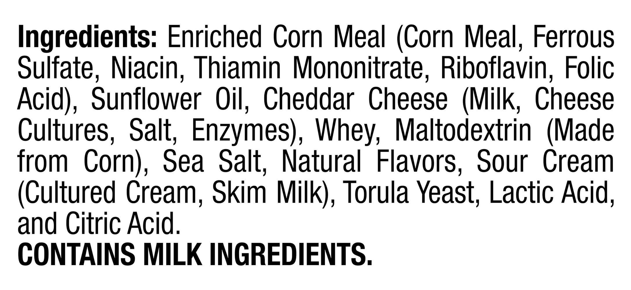 Ingredients: Enriched Corn Meal (Corn Meal Ferrous Sulfate Niacin Thiamin Mononitrate Riboflavin Folic Acid), Sunflower Oil, Cheddar Cheese (Milk Cheese Cultures Salt Enzymes), Whey, Maltodextrin (Made from Corn), Sea Salt, Natural Flavors, Sour Cream (Cultured Cream Skim Milk), Torula Yeast, Lactic Acid, and Citric Acid Contains: Milk, Corn