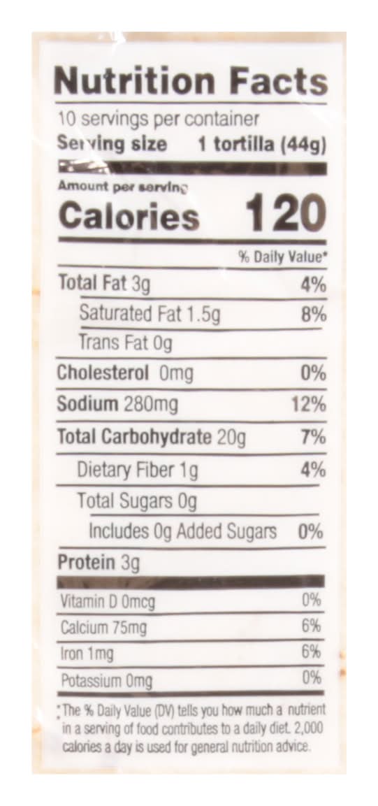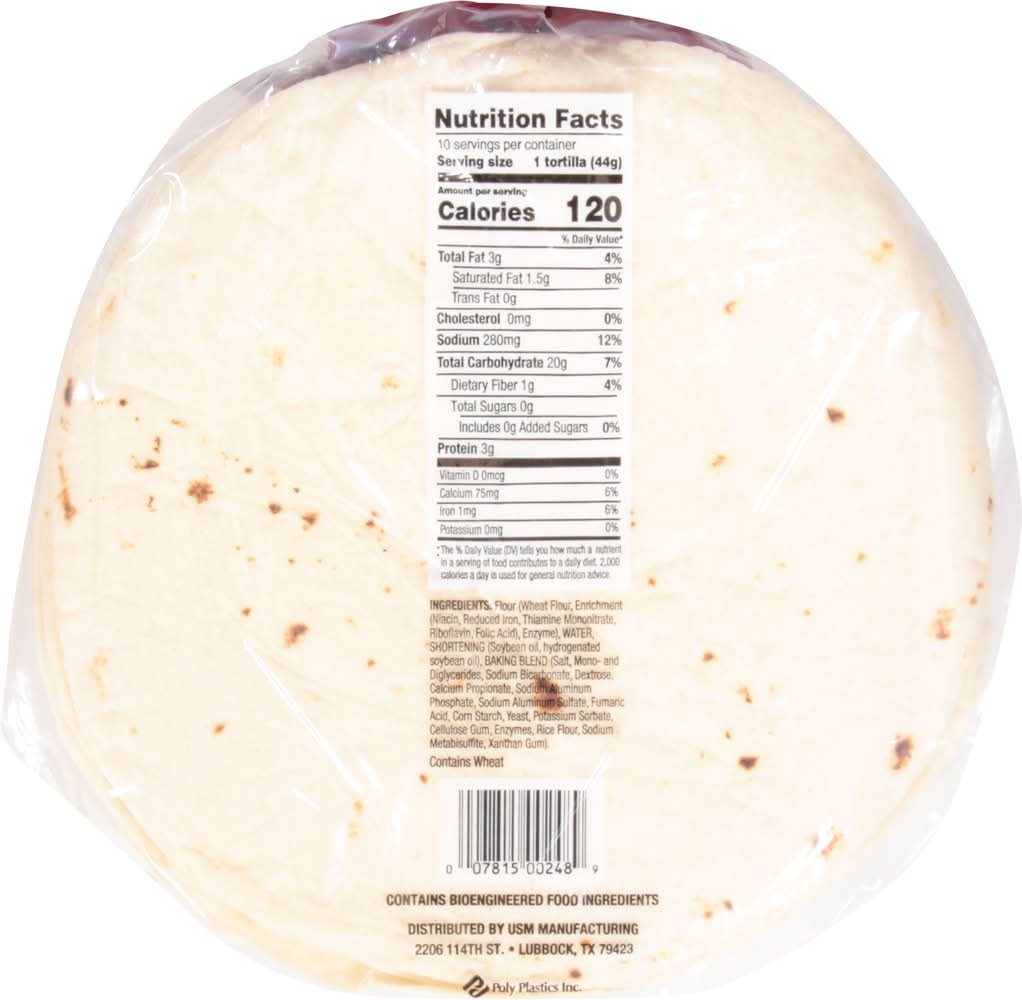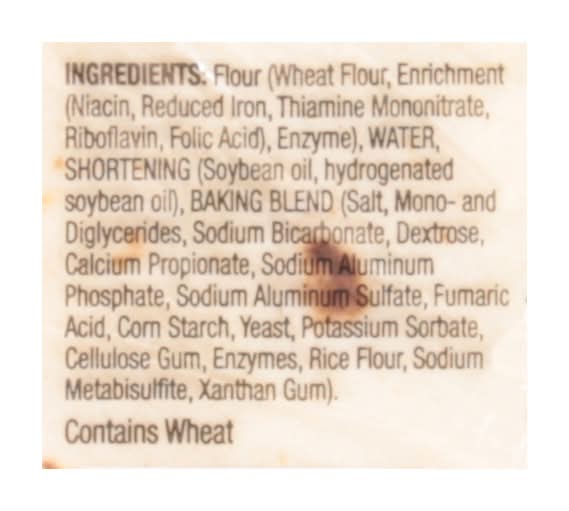 Ingredients: Flour (Wheat Flour, Enrichment (Niacin, Reduced Iron, Thiamine Mononitrate, Riboflavin, Folic Acid), Enzyme), Water, Shortening (Soybean Oil, Hydrogenated Soybean Oil), Baking Blend (Salt, Mono- and Diglycerides, Sodium Bicarbonate, Dextrose, Calcium Propionate, Sodium Aluminum Phosphate, Sodium Aluminum Sulfate, Fumaric Acid, Corn Starch, Yeast, Potassium Sorbate, Cellulose Gum, Enzymes, Rice Flour, Sodium Metabisulfite, Xanthan Gum) Contains: Wheat, Soybeans, Sulfites