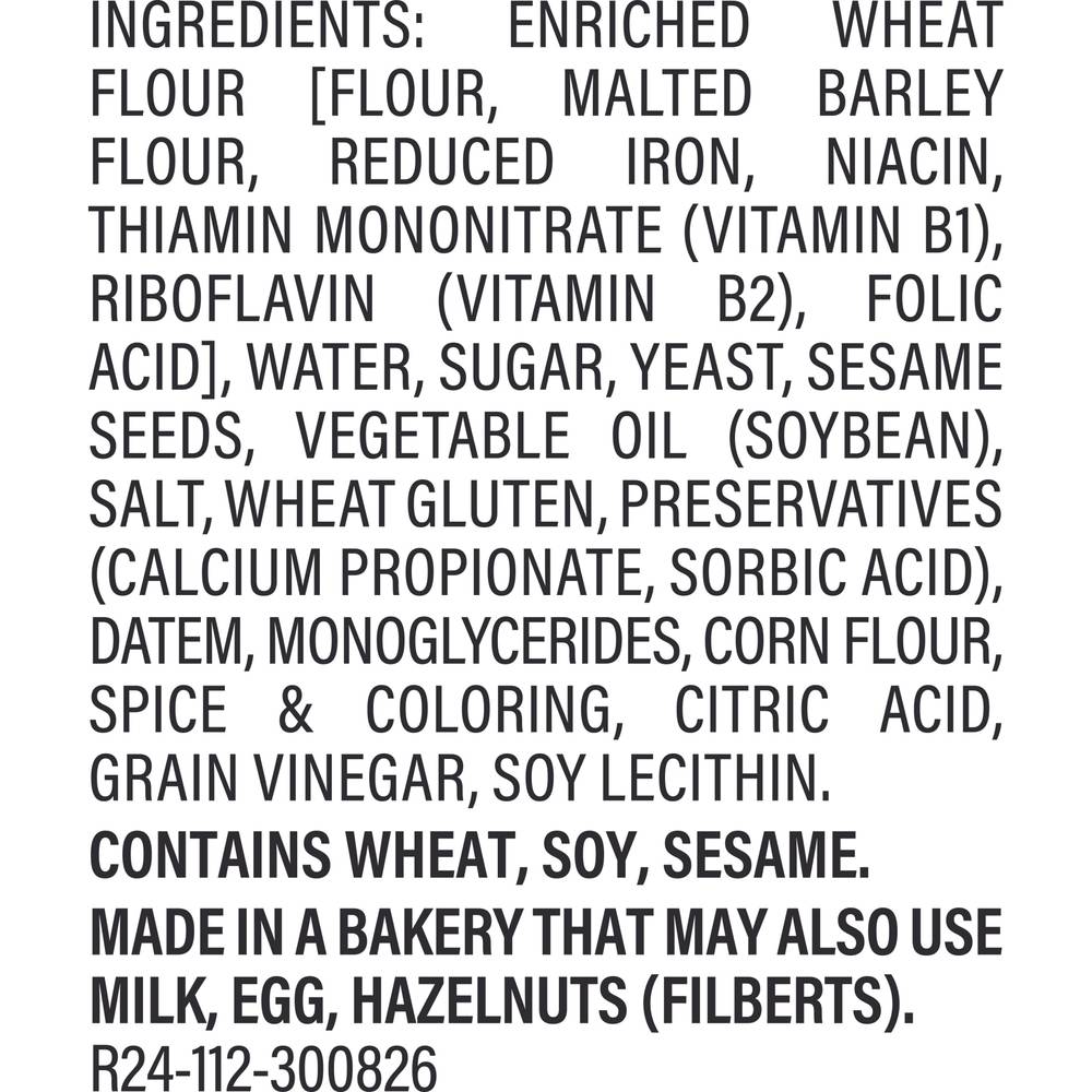 Ingredients: ENRICHED WHEAT FLOUR [FLOUR, MALTED BARLEY FLOUR, REDUCED IRON, NIACIN, THIAMIN MONONITRATE (VITAMIN B1), RIBOFLAVIN (VITAMIN B2), FOLIC ACID], WATER, SUGAR, YEAST, SESAME SEEDS, VEGETABLE OIL (SOYBEAN), SALT, WHEAT GLUTEN, PRESERVATIVES [CALCIUM PROPIONATE, SORBIC ACID], DATEM, MONOGLYERIDES, CORN FLOUR, SPICE COLORING, CITRIC ACID, GRAIN VINEGAR, SOY LECITHIN. Contains: CONTAINS SESAME, SOY, WHEAT.