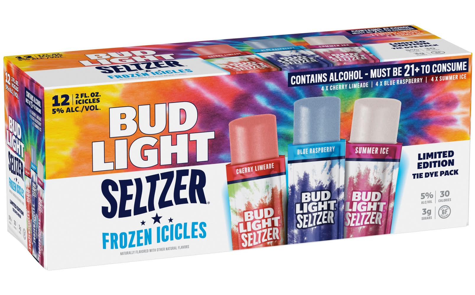 Bud Light Seltzer Frozen Icicles Cherry Limeade, Blue Raspberry & Summer Ice Tie Dye Variety Pack, 12 Pack 2 fl. oz. Tubes, 5% ABV • Pack size: 12 • Alcohol by volume: 5%