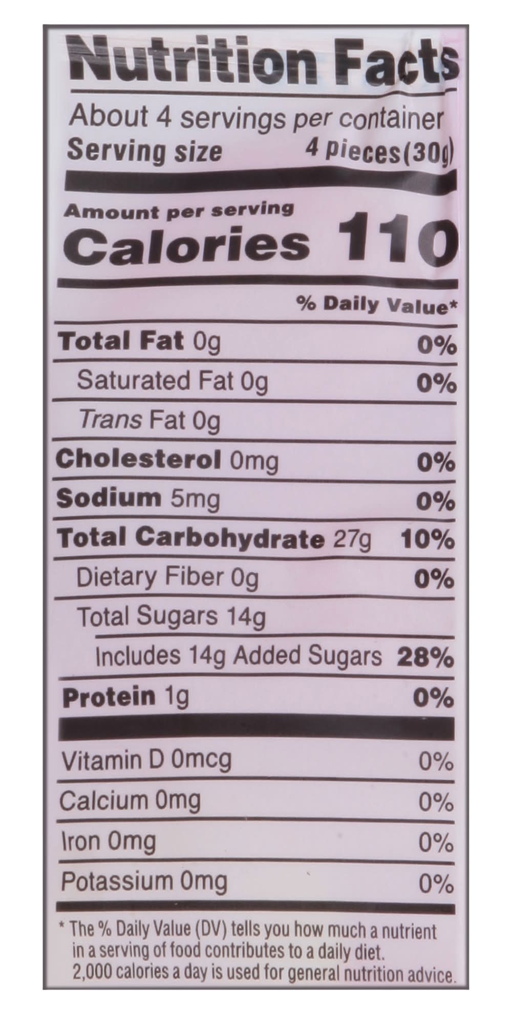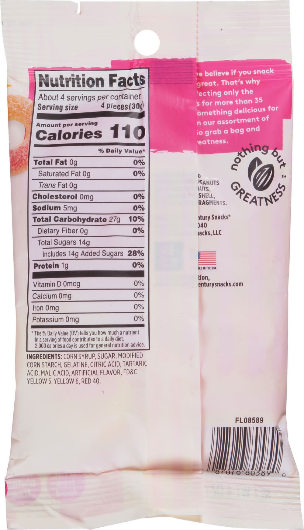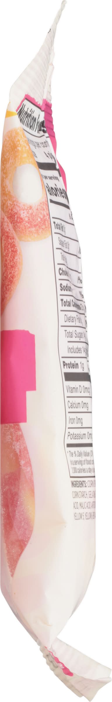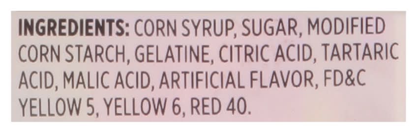 Ingredients: Corn Syrup, Sugar, Modified Corn Starch, Gelatine, Citric Acid, Tartaric Acid, Malic Acid, Artificial Flavor, FD&C Yellow 5, Yellow 6, Red 40 Contains: 'Corn Contains', 'Peanuts May Contain', 'Tree Nuts May Contain'