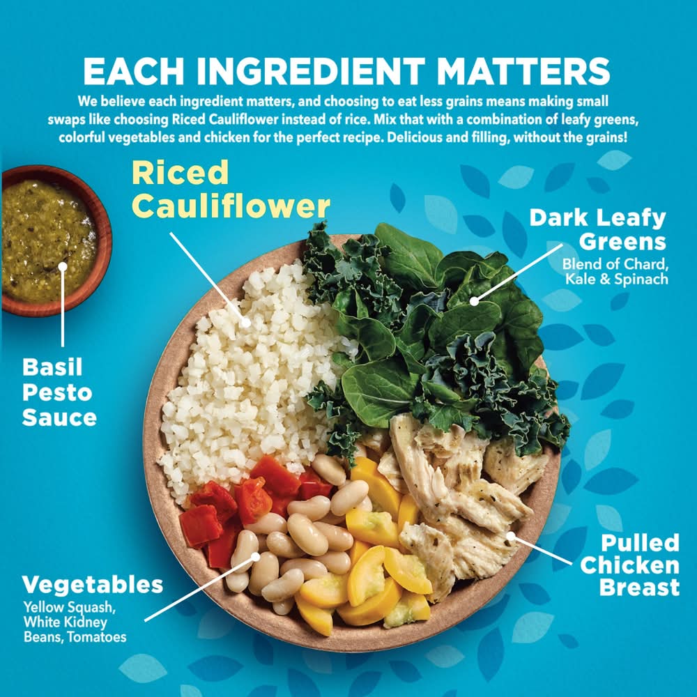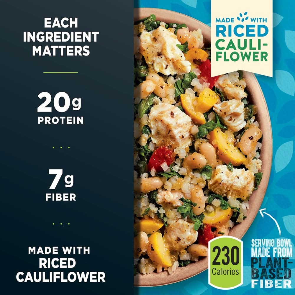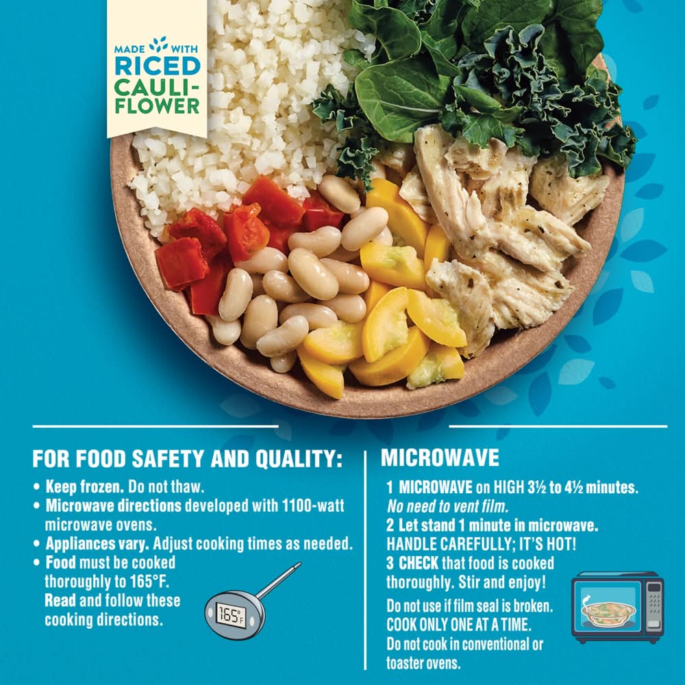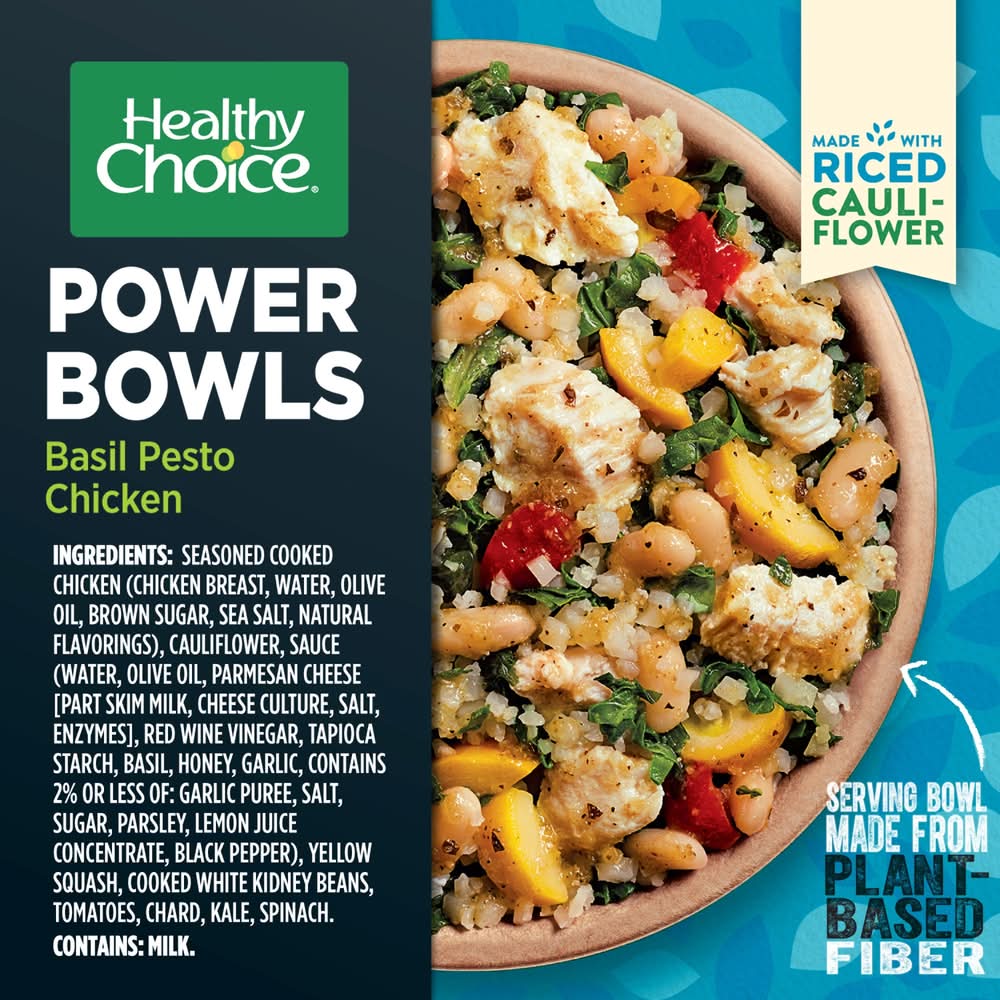 Liven up your day with Healthy Choice Power Bowls Basil Pesto Chicken with Riced Cauliflower. Healthy Choice frozen entrees are a delicious way to get a reliable source of fiber and protein to help you power through your day. This frozen meal features pulled all-natural* chicken breast and a mix of white kidney beans and vegetables, including dark leafy greens, yellow squash and tomatoes with basil pesto sauce, perfect for gluten free meals with bold flavor. A delicious way to keep you feeling satisfied, this frozen meal fits a low carb lifestyle with 10 grams of net carbs per serving (17 g total carbs minus 7 g dietary fiber). This power bowl provides 30% of your daily protein with 20 grams per serving, perfect as frozen dinners for satisfying lunches or quick meals. Simply microwave this frozen chicken bowl for 3 1/2 to 4 1/2 minutes and let stand for 1 minute. This 9.25 ounce frozen dinner comes in a serving bowl made from plant-based fiber for easy enjoyment anywhere. Keep in the freezer until ready to enjoy. Healthy Choice never compromises on ingredients so you can taste the goodness in every bite. *No artificial ingredients. Minimally processed. • Conagra Brands, P.O. Box 3534,Chicago,IL, 60654 • Packaging: Reusable