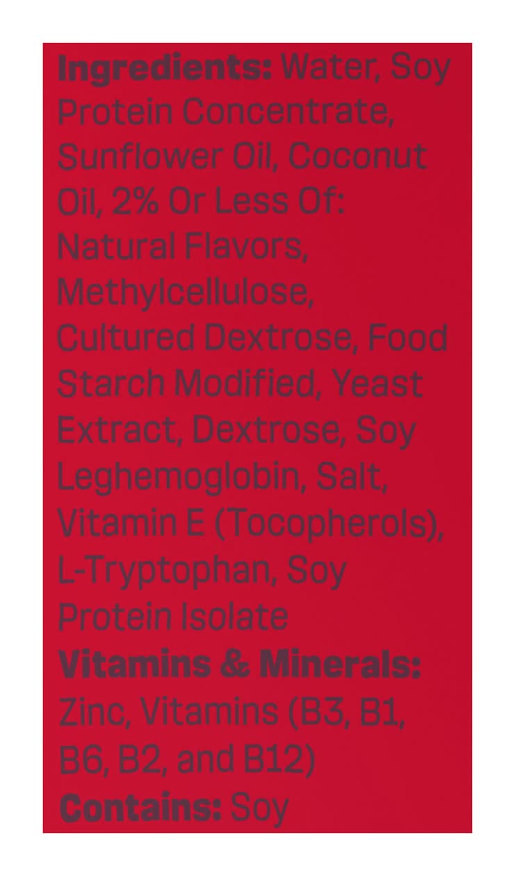 Ingredients: Ingredients: Water, Soy Protein Concentrate, Sunflower Oil, Coconut Oil, 2% Or Less Of: Natural Flavors, Methylcellulose, Cultured Dextrose, Food Starch Modified, Yeast Extract, Dextrose, Soy Leghemoglobin, Salt, Vitamin E (Tocopherols), L-Tryptophan, Soy Protein Isolate Vitamins & Minerals: Zinc, Vitamins (B3, B1, B6, B2, and B12) Contains: Soybeans, Tree Nuts, coconut