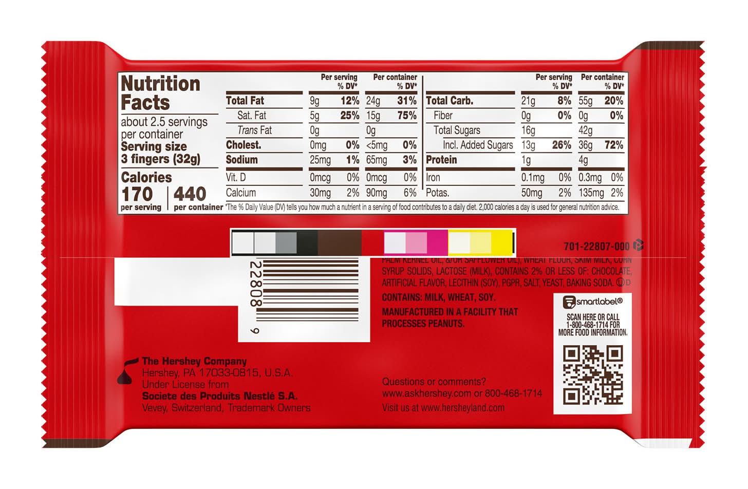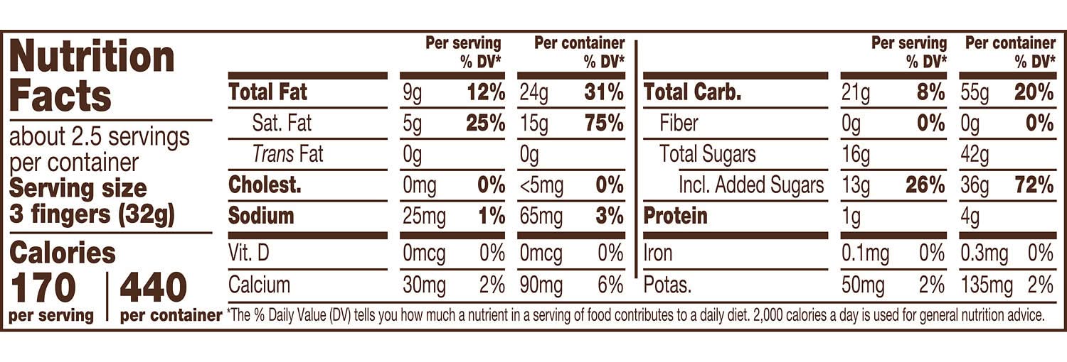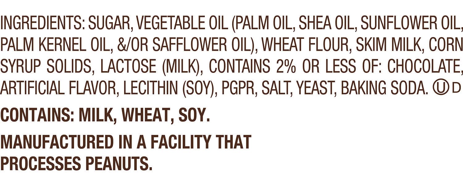 Ingredients: SUGAR, VEGETABLE OIL (PALM OIL, SHEA OIL, SUNFLOWER OIL, PALM KERNEL OIL, /OR SAFFLOWER OIL), WHEAT FLOUR, SKIM MILK, CORN SYRUP SOLIDS, LACTOSE (MILK), CONTAINS 2% OR LESS OF: CHOCOLATE, ARTIFICIAL FLAVOR, LECITHIN (SOY), PGPR, SALT, YEAST, BAKING SODA. Contains: Contains: Does Not Contain Any Of The 8 Major Allergens
